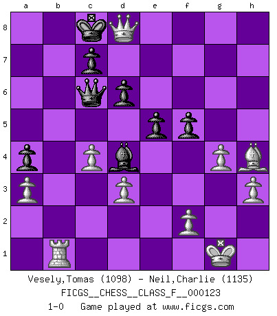 Last move : 1-0 2013 February 17 17:18:27 [Event "FICGS__CHESS__CLASS_F__000123"] [Site "FICGS"] [Date "2013.01.30"] [Round "1"] [White "Vesely,Tomas"] [Black "Neil,Charlie"] [Result "1-0"] [WhiteElo "1098"] [BlackElo "1135"] 1.e4 e5 2.c4 Nc6 3.Nc3 Bc5 4.Nf3 d6 5.Nd5 Nf6 6.Be2 a5 7.a3 Nxe4 8.O-O Be6 9.d3 Nf6 10.Bg5 h6 11.Nxf6+ gxf6 12.Bh4 Nd4 13.Nxd4 Bxd4 14.Bf3 Qe7 15.Bxb7 Rb8 16.Bc6+ Bd7 17.Bxd7+ Kxd7 18.Qa4+ Ke6 19.Rfe1 Rxb2 20.Rab1 Rxb1 21.Rxb1 Rg8 22.h3 Qd7 23.Qd1 Qc6 24.g4 f5 25.Qd2 a4 26.Qxh6+ Kd7 27.Qf6 Re8 28.Qxf7+ Re7 29.Qxe7+ Kc8 30.Qd8+ 1-0 King's pawn game Kingside Castling by player White (move 8) Player White won this chess game. Follow this game move after move (download)The King is a fighting piece. Use it ! (Wilhelm Steinitz) Es ist besser die Steine des Gegners zu opfern. (Savielly Grigorievitsch Tartakower) La vida es como el Ajedrez, con lucha, competición y eventos buenos y malos. (Benjamin Franklin) Les Echecs représentent une sphère d'idées créatrices basée sur la volonté des deux protagonistes. (Smyslov) Fortune favours the audacious. (Desiderius Erasmus)
