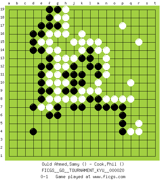 Last move : 0-1 2007 May 22 14:55:59 [Event "FICGS__GO__TOURNAMENT_KYU__000020"] [Site "FICGS"] [Date "2007.01.25"] [Round "1"] [Black "Ould Ahmed,Samy"] [White "Cook,Phil"] [Result "0-1"] 1.n7 r15 2.d16 p17 3.l12 r5 4.p6 q4 5.p5 r4 6.p4 f16 7.f17 g16 8.e17 k16 9.g15 h16 10.h15 j15 11.f15 q10 12.k13 k14 13.j14 j13 14.h14 g13 15.f13 k12 16.l13 m10 17.j12 h13 18.k11 k9 19.l14 k15 20.d4 o8 21.j9 n8 22.o7 q8 23.p7 p8 24.m8 m9 25.k10 l9 26.l8 g12 27.f12 g11 28.g10 f11 29.e11 h10 30.h9 g9 31.e10 f10 32.f9 g8 33.g7 f8 34.e9 h8 35.j10 j8 36.h11 g10 37.e8 f7 38.g6 k8 39.m7 h12 40.j11 e15 41.d15 f14 42.e12 g14 43.e14 n12 44.e16 f15 45.d14 n14 46.k7 m15 47.m12 n11 48.m11 n13 49.f6 e7 50.d7 h17 51.g17 g18 52.f18 h19 53.f19 l15 54.g19 h18 55.j7 m14 0-1 Here are the names of the openings (joseki) played in the four corners : Corner q4 : n7 r5 This joseki is unknown. A weak or weird move has probably been played in this corner. Corner d16 : d16 f16 Hoshi (Hwajeom, Seongjeom, Xingwei`) 4-4 Point. The star or hoshi (4-4) point, emphasizing influence at the potential expense of territory. Ikken Takagakari (Hankan Nop'dakeolch'im, Yi Gaojia, 1-Space High Approach). Black typically responds at 6-4 or 3-10. Black 4-10 is played when Black finds play on the right side advantageous. Black 4-8 or 3-8 may be played when Black has support at top. Player White won this Go (weiqi, baduk) game. Follow this game move after move (download)If you don't know ladders, don't play go. (Anonymous) Without deviation from the norm, progress is not possible. (Frank Zappa)