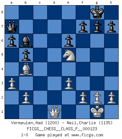 Last move : 1-0 2013 February 13 1:4:44 [Event "FICGS__CHESS__CLASS_F__000123"] [Site "FICGS"] [Date "2013.01.30"] [Round "1"] [White "Vermeulen,Aad"] [Black "Neil,Charlie"] [Result "1-0"] [WhiteElo "1200"] [BlackElo "1135"] 1.d4 Nf6 2.c4 e6 3.Nf3 d5 4.Nc3 c6 5.e3 a6 6.Bd3 dxc4 7.Bxc4 b5 8.Bd3 c5 9.O-O Nc6 10.dxc5 Bxc5 11.Ne4 Nxe4 12.Bxe4 Bb7 13.Bd2 Rc8 14.Rc1 Bb6 15.Bc3 O-O 16.a3 Na5 17.Bxb7 Nxb7 18.Qe2 Nc5 19.Rfd1 Qe7 20.Bb4 Qa7 21.Ne5 Nb3 22.Rxc8 Rxc8 23.Qd3 Rc1 24.Qxb3 Rxd1+ 25.Qxd1 1-0 Queen's pawn game Kingside Castling by player White (move 9) Kingside Castling by player Black (move 15) Player White won this chess game. Follow this game move after move (download)Chess books should be used as we use glasses: to assist the sight, although some players make use of them as if they thought they conferred sight. (Jose Raul Capablanca) Wie bekannt hörte Morphy 1859 auf, Schach zu spielen. Seine Enttäuschung galt nicht so sehr dem Schach, wie den Schachspielern. (Robert James Fischer) El Ajedrez no es como la vida... ¡tiene reglas!. (Mark Pasternak) Vouloir jouer aux échecs contre soi-même est aussi paradoxal que vouloir marcher sur son ombre. (Stefan Zweig) Who needs drugs and alcohol if he can play Big Chess at FICGS ? (Heinz-Georg Lehnhoff)