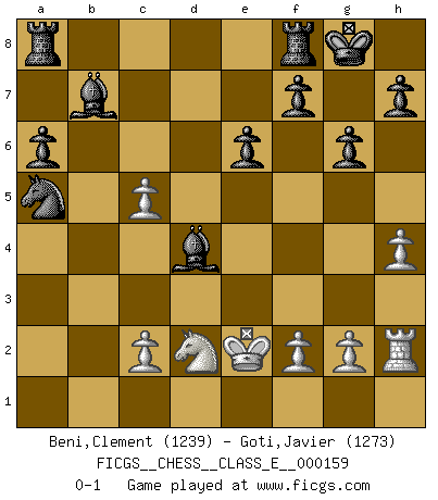 Last move : 0-1 2013 April 15 22:58:32 [Event "FICGS__CHESS__CLASS_E__000159"] [Site "FICGS"] [Date "2013.02.01"] [Round "1"] [White "Beni,Clement"] [Black "Goti,Javier"] [Result "0-1"] [WhiteElo "1239"] [BlackElo "1273"] 1.e4 c5 2.Nc3 Nc6 3.d3 g6 4.Nf3 Bg7 5.a4 a6 6.Be2 e6 7.Bd2 Nf6 8.Bg5 O-O 9.d4 Qb6 10.b3 cxd4 11.a5 Qb4 12.Bd2 dxc3 13.Ra4 cxd2+ 14.Qxd2 Qxd2+ 15.Nxd2 d5 16.exd5 Nxd5 17.h4 Nc3 18.Rc4 Nxe2 19.Kxe2 Nxa5 20.Rc5 b6 21.b4 bxc5 22.bxc5 Bb7 23.Rh2 Bd4 0-1 Sicilian : Closed, 2...Nc6 Kingside Castling by player Black (move 8) Player Black won this chess game. Follow this game move after move (download)I feel as if I were a piece in a game of Chess, when my opponent says of it: That piece cannot be moved. (Soren Kierkegaard) Fischer ist das größte Genie, das je vom Schachhimmel heruntergestiegen ist. (Mikhail Nekhemyevich Tal) Para mi, el Ajedrez es la vida y cada partida es como una nueva vida. Todo jugador de Ajedrez suele vivir muchas vidas durante su vida. (Eduard Gufeld) Je crois qu'il existe des manières très spécifiques de jouer efficacement contre une machine. Evidemment, nous n'avons aucune chance en technique pure, parce que l'ordinateur calcule de manière parfaite. Mais lorsque nous faisons appel à notre cerveau, en utilisant l'intuition et la compréhension, alors nous restons beaucoup plus forts. (Anatoli Karpov) 'preceded by its own quotation yields a falsehood' preceded by its own quotation yields a falsehood. (W. V. O. Quine - Set Theory And Its Logic, 1953)