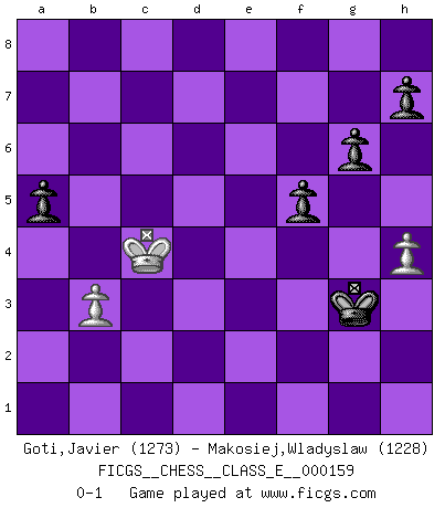 Last move : 0-1 2013 June 30 21:32:30 [Event "FICGS__CHESS__CLASS_E__000159"] [Site "FICGS"] [Date "2013.02.01"] [Round "1"] [White "Goti,Javier"] [Black "Makosiej,Wladyslaw"] [Result "0-1"] [WhiteElo "1273"] [BlackElo "1228"] 1.c4 g6 2.Nc3 Bg7 3.d4 c5 4.e3 Nf6 5.g3 cxd4 6.exd4 d5 7.b3 Nc6 8.Bb2 O-O 9.Bg2 dxc4 10.Nge2 cxb3 11.axb3 Bg4 12.f3 Bf5 13.O-O Nb4 14.Ne4 Rc8 15.N2c3 a6 16.Ba3 Nc6 17.Rc1 Qxd4+ 18.Qxd4 Nxd4 19.Bxe7 Nxe4 20.fxe4 Rfe8 21.exf5 Rxe7 22.f6 Bxf6 23.Rxf6 Rxc3 24.Rxc3 Ne2+ 25.Kf1 Nxc3 26.Rb6 Ne4 27.Bxe4 Rxe4 28.Rxb7 a5 29.Ra7 Re5 30.Kf2 Kg7 31.Ra6 Kh6 32.h4 Rf5+ 33.Ke3 Kh5 34.Rc6 Kg4 35.Rc3 Rf3+ 36.Kd4 Rxc3 37.Kxc3 Kxg3 38.Kc4 f5 0-1 English Opening Kingside Castling by player Black (move 8) Kingside Castling by player White (move 13) 10 pieces endgame at move 36 : White KPPP , Black KRPPPP WHITE : King + 3 Pawns BLACK : King + 1 Rook 4 Pawns 9 pieces endgame at move 37 : White KPPP , Black KPPPP WHITE : King + 3 Pawns BLACK : King + 4 Pawns 8 pieces endgame at move 37 : White KPP , Black KPPPP WHITE : King + 2 Pawns BLACK : King + 4 Pawns Player Black won this chess game. Follow this game move after move (download)If a ruler does not understand Chess, how can he rule over a kingdom ? (King Khusros II) Ohne Leiden bildet sich kein Charakter. (Ernst Freiherr von Feuchtersleben) Realmente no sabemos como el juego fue inventado, aunque hay sospechas. Tan pronto como descubramos a los culpables, se los haremos saber. (Bruce Pandolfini) Des points faibles ou des trous dans la position de l'adversaire doivent être occupés par des pièces et non pas par des pions. (Siegbert Tarrasch) Memory is a way of holding onto the things you love, the things you are, the things you never want to lose. (from the television show: The Wonder Years)