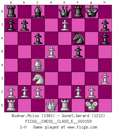 Last move : 1-0 2013 February 6 13:4:19 [Event "FICGS__CHESS__CLASS_E__000159"] [Site "FICGS"] [Date "2013.02.01"] [Round "1"] [White "Budnar,Milos"] [Black "Gonet,Gerard"] [Result "1-0"] [WhiteElo "1381"] [BlackElo "1212"] 1.e4 e5 2.Nf3 f5 3.Nxe5 Nf6 4.Bc4 d5 5.exd5 Bd6 6.d4 O-O 7.O-O Bxe5 8.dxe5 Ng4 9.Bf4 Nd7 10.e6 Ndf6 11.h3 Nh6 12.Bxh6 gxh6 13.Nc3 c6 14.Re1 Qe8 15.e7 1-0 Latvian counter-gambit Kingside Castling by player Black (move 6) Kingside Castling by player White (move 7) Player White won this chess game. Follow this game move after move (download)First-class players lose to second class players because second-class players sometimes play a first-class game. (Tarrasch) Ich bin Weltmeister und muß mit niemandem irgend etwas diskutieren. (Viswanathan Anand) El Ajedrez es un terrible juego. Si no controlas el centro, tu oponente tiene una posición mas holgada. Si tienes control del centro, ¡entonces realmente tu tienes algo de que preocuparte!. (Siegbert Tarrasch) RxDa4 pat (...) In theory there is no difference between theory and practice. In practice there is. (Yogi Berra)