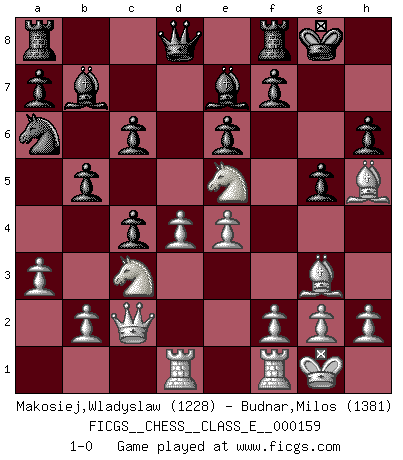 Last move : 1-0 2013 February 12 7:37:7 [Event "FICGS__CHESS__CLASS_E__000159"] [Site "FICGS"] [Date "2013.02.01"] [Round "1"] [White "Makosiej,Wladyslaw"] [Black "Budnar,Milos"] [Result "1-0"] [WhiteElo "1228"] [BlackElo "1381"] 1.d4 d5 2.c4 c6 3.Nf3 Nf6 4.Nc3 e6 5.Bg5 dxc4 6.e4 h6 7.Bh4 g5 8.Bg3 b5 9.Be2 Bb4 10.Qc2 Na6 11.O-O O-O 12.a3 Be7 13.Rad1 Nh5 14.Ne5 Bb7 15.Bxh5 1-0 QGD Slav : 4.Nc3 Kingside Castling by player White (move 11) Kingside Castling by player Black (move 11) Player White won this chess game. Follow this game move after move (download)Modern Chess is too much concerned with things like Pawn structure. Forget it, Checkmate ends the game. (Nigel Short) Wenn Schach ein enormer Dschungel ist, der seine Myriaden von Geheimnissen nicht preisgeben will, dann sind Computer die Kettensägen einer gewaltigen ökologisch unsensiblen Nutzholzfirma. (Nigel Short) Si yo gano un torneo, yo lo gano por mí mismo. Yo hago las jugadas. Nadie me ayuda. (Bobby Fischer) Les Echecs représentent une sphère d'idées créatrices basée sur la volonté des deux protagonistes. (Smyslov) No man has ever achieved immortality in his own life time. (Unknown)
