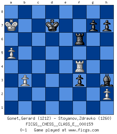Last move : 0-1 2013 February 3 20:58:1 [Event "FICGS__CHESS__CLASS_E__000159"] [Site "FICGS"] [Date "2013.02.01"] [Round "1"] [White "Gonet,Gerard"] [Black "Stoyanov,Zdravko"] [Result "0-1"] [WhiteElo "1212"] [BlackElo "1260"] 1.d4 d5 2.e4 dxe4 3.Nc3 Bf5 4.f3 exf3 5.Qxf3 Qc8 6.Bd3 Qe6+ 7.Nge2 Bg4 8.Qxb7 Qc6 9.Be4 Qxb7 10.Bxb7 e6 11.Nb5 Bd6 12.Bf4 Bxe2 13.Bxd6 Bxb5 14.Bxc7 Na6 15.Bxa8 Nxc7 16.Bf3 Ne7 17.O-O-O O-O 18.Rhe1 Ncd5 19.b3 Rc8 20.Bxd5 Nxd5 21.Kb2 Nb4 22.c4 Ba6 23.d5 exd5 24.cxd5 Nd3+ 25.Rxd3 Bxd3 26.Rd1 Be4 27.d6 Bxg2 28.Ka3 Bh3 29.Kb4 Kf8 30.Ka5 Ke8 31.Ka6 Kd7 32.a4 Rc6+ 33.Kxa7 Rxd6 34.Rc1 f5 35.a5 Rc6 36.Re1 f4 37.Re4 f3 38.Rf4 Rf6 0-1 Blackmar gambit Queenside Castling by player White (move 17) Kingside Castling by player Black (move 17) Player Black won this chess game. Follow this game move after move (download)Up to this point White has been following well-known analysis. But now he makes a fatal error: he begins to use his own head. (Siegbert Tarrasch) Wenn Du nicht kämpfst, um anderen etwas zu beweisen, sondern nur für Dich selbst, dann bist du fast unbesiegbar. (Garry Kasparov) Para mi, el Ajedrez es la vida y cada partida es como una nueva vida. Todo jugador de Ajedrez suele vivir muchas vidas durante su vida. (Eduard Gufeld) Lorsque vous vous retrouvez devant une position atroce, ne tendez pas un ultime piège dérisoire avec l'intention d'abandonner si l'adversaire le déjoue ! Faites-vous plutôt un devoir de résister comme si votre vie en dépendait. Jouez le coup qui vous déplairait au centuple si vous étiez dans la peau de votre tortionnaire ! Luck is what you have left over after you give 100 percent. (Langston Coleman)