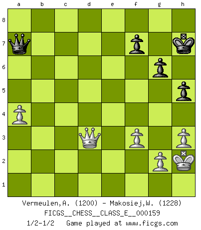 Last move : 1/2-1/2 2013 November 18 18:34:33 [Event "FICGS__CHESS__CLASS_E__000159"] [Site "FICGS"] [Date "2013.02.01"] [Round "1"] [White "Vermeulen,Aad"] [Black "Makosiej,Wladyslaw"] [Result "1/2-1/2"] [WhiteElo "1200"] [BlackElo "1228"] 1.d4 g6 2.c4 Bg7 3.Nf3 c5 4.e3 Nf6 5.Be2 O-O 6.O-O cxd4 7.Nxd4 Nc6 8.Nc3 Nxd4 9.exd4 d5 10.c5 b6 11.b4 bxc5 12.bxc5 Ne4 13.Qd3 Nxc3 14.Qxc3 Bd7 15.Be3 Bc6 16.Rfb1 Qc7 17.a4 a5 18.Rb6 e5 19.h3 Rab8 20.Qb2 Rb7 21.Rxb7 Bxb7 22.Rb1 Bc6 23.Bb5 Rb8 24.Qc3 h5 25.dxe5 Bxe5 26.Bd4 Bxd4 27.Qxd4 Qb7 28.Qe5 Rd8 29.Qf6 Rc8 30.Rb2 Rb8 31.Qc3 Kh7 32.Qxa5 Kg8 33.Qc3 Kh7 34.f3 Qc7 35.Bxc6 Rxb2 36.Qxb2 Qxc6 37.Qd4 Kg8 38.Qb4 Qf6 39.Qb8+ Kg7 40.Qd6 Qa1+ 41.Kh2 d4 42.Qe5+ Kg8 43.Qb8+ Kg7 44.c6 d3 45.Qb4 Qf6 46.c7 Qe5+ 47.Kg1 Qxc7 48.Qd4+ Kh7 49.Qxd3 Qa7+ 50.Kh2 1/2-1/2 Modern defense Kingside Castling by player Black (move 5) Kingside Castling by player White (move 6) This chess game ended in a draw. Follow this game move after move (download)The sign of a great Master is his ability to win a won game quickly and painlessly. (Irving Chernev) Modernes Schach erfordert enorme Anspannung. Es ist für einen normalen Menschen unmöglich das auszuhalten. (Viktor Kortschnoi) Con el tiempo, empecé a progresar en partidas decisivas. Tal vez porque me di cuenta de una simple verdad: no solo estaba yo nervioso sino también mi oponente. (Mikhail Tal) Je crois qu'il existe des manières très spécifiques de jouer efficacement contre une machine. Evidemment, nous n'avons aucune chance en technique pure, parce que l'ordinateur calcule de manière parfaite. Mais lorsque nous faisons appel à notre cerveau, en utilisant l'intuition et la compréhension, alors nous restons beaucoup plus forts. (Anatoli Karpov) History is the quarrels of popes and kings, with wars or pestilences in every page; the men all so good for nothing, and hardly any women at all. (Jane Austen)