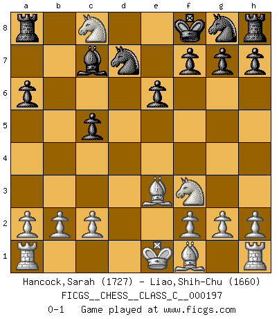 Last move : 0-1 2013 May 9 22:12:51 [Event "FICGS__CHESS__CLASS_C__000197"] [Site "FICGS"] [Date "2013.02.02"] [Round "1"] [White "Hancock,Sarah"] [Black "Liao,Shih-Chu"] [Result "0-1"] [WhiteElo "1727"] [BlackElo "1660"] 1.e4 c5 2.Nc3 d6 3.Nf3 a6 4.d4 b6 5.dxc5 bxc5 6.e5 e6 7.exd6 Bxd6 8.Ne4 Be7 9.Qxd8+ Bxd8 10.Nd6+ Kf8 11.Nxc8 Bc7 12.Be3 Nd7 0-1 Sicilian : Closed Player Black won this chess game. Follow this game move after move (download)In Chess, at least, the brave inherit the earth. (Edmar Mednis) Fischer machte Schach einfach zu einer aufregenden Sache, wann immer er sich ans Brett setzte. (Raymond Keene) Uno no tiene que jugar muy bien, es suficiente jugar mejor que el oponente. (Siegbert Tarrasch) Les Echecs ne sont pas pour les âmes timides. Ils requièrent un homme entier, qui ne s'arrête pas aveuglément à ce qui a été déjà établi, mais qui tente individuellement de sonder les profondeurs du jeu. (W. Steinitz) Your best chance to get a Royal Flush in a casino is in the bathroom. (Anonymous)