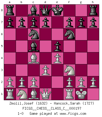 Last move : 1-0 2013 May 2 21:46:12 [Event "FICGS__CHESS__CLASS_C__000197"] [Site "FICGS"] [Date "2013.02.02"] [Round "1"] [White "Zmolil,Josef"] [Black "Hancock,Sarah"] [Result "1-0"] [WhiteElo "1632"] [BlackElo "1727"] 1.e4 e5 2.Nf3 Nc6 3.Bc4 Nf6 4.d3 Bc5 5.O-O 1-0 This chess game has been lost on time (started : 2013.02.02 11:15:46) Two knights defense (Modern Bishop's Opening) Kingside Castling by player White (move 5) Player White won this chess game. Follow this game move after move (download)As one by one I mowed them down, my superiority soon became apparent. (Jose Capablanca) Sitze auf Deine Hände. (Siegbert Tarrasch) Un Peón pasado aumenta su poder a medida de que el número de piezas en el tablero disminuye. (Capablanca) Comme les marins qui ont mille raisons différentes d'aller en mer, les joueurs d'échecs en ont tout autant avant de s'installer devant une table et jouer... (Vincent Bertignac, philosophe) The difference between perseverance and obstinacy is that one comes from a strong will, and the other from a strong won't. (Henry Ward Beecher)