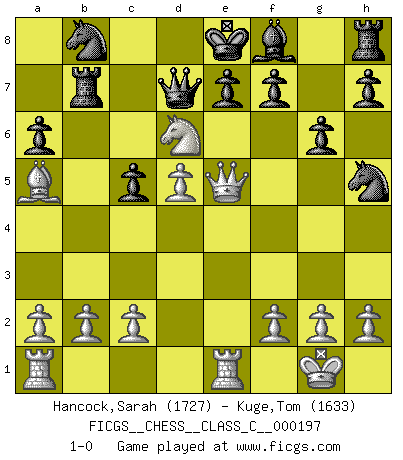 Last move : 1-0 2013 February 6 7:0:48 [Event "FICGS__CHESS__CLASS_C__000197"] [Site "FICGS"] [Date "2013.02.02"] [Round "1"] [White "Hancock,Sarah"] [Black "Kuge,Tom"] [Result "1-0"] [WhiteElo "1727"] [BlackElo "1633"] 1.d4 Nf6 2.Nf3 c5 3.d5 b5 4.Bf4 d6 5.e4 Nxe4 6.Bxb5+ Bd7 7.Bd3 Nf6 8.Nc3 g6 9.Qe2 Qb6 10.O-O Nh5 11.Bd2 Bg4 12.Bb5+ Bd7 13.Rfe1 Bxb5 14.Nxb5 a6 15.Na3 Ra7 16.Nc4 Qd8 17.Ba5 Qd7 18.Nfe5 dxe5 19.Qxe5 Rb7 20.Nd6+ 1-0 Queen's pawn game Kingside Castling by player White (move 10) Player White won this chess game. Follow this game move after move (download)I'd rather have a Pawn than a finger. (Reuben Fine) Die Elozahlen sind sehr schlecht für das Schach. Jetzt ist Schach eine Sportindustrie, die darauf zielt Elopunkte zu machen. (Miguel Najdorf) Todavía soy una víctima del Ajedrez. Tiene toda la belleza del arte y mucho mas. No puede ser comercializado. El Ajedrez es mas puro que el arte en su posición social. (Marcel Duchamp) Tous ces prétendus hommes politiques sont les pions, les Cavaliers, les Tours ou les Fous d'une partie d'échecs qui se jouera tant qu'un hasard ne renversera pas l'échiquier. (Honoré de Balzac) Being number two sucks. (Andre Agassi)