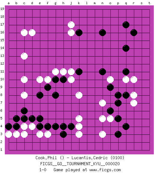 Last move : 1-0 2007 April 13 10:53:59 [Event "FICGS__GO__TOURNAMENT_KYU__000020"] [Site "FICGS"] [Date "2007.01.25"] [Round "1"] [Black "Cook,Phil"] [White "Lucantis,Cedric"] [Result "1-0"] [Rating 2 "0100"] 1.r16 d4 2.q17 d16 3.c6 c8 4.d5 c4 5.c5 c10 6.p3 c16 7.q4 r10 8.q14 r7 9.e4 e3 10.e5 f3 11.f4 j17 12.n16 k3 13.b4 b3 14.b5 a3 15.a4 c3 16.g4 n3 17.p7 o10 18.h4 k5 19.j4 k4 20.h3 c13 21.k16 j16 22.q11 q10 23.q8 r8 24.p8 k8 25.e8 e10 26.f9 f10 27.g8 j10 28.k11 j11 29.n11 o5 30.p5 n7 31.o6 n5 32.g10 g11 33.h10 h11 34.o9 1-0 This go game has been lost on time (started : 2007.01.25 18:56:11) Here are the names of the openings (joseki) played in the four corners : Corner d4 : d4 c6 Hoshi (Hwajeom, Seongjeom, Xingwei`) 4-4 Point. The star or hoshi (4-4) point, emphasizing influence at the potential expense of territory. Ikken Kakari (Hankan Keolch'im, Yi Gua`jiao~, 1-Space Low Approach). Black 2 is the standard approach move to the 4-4. Player Black won this Go (weiqi, baduk) game. Follow this game move after move (download)Don't overlook the edge of the board. (Anonymous) Yoga is 99% practice and 1% knowledge. (Sri Krishna Pattabhi Jois)