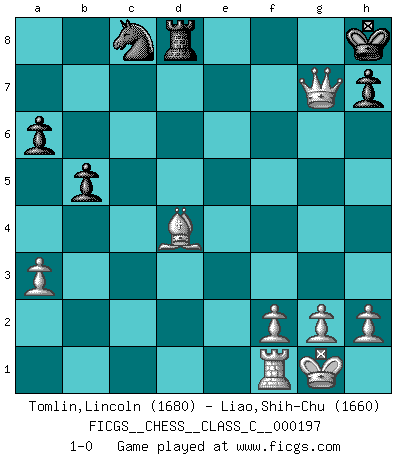 Last move : 1-0 2013 July 8 3:10:31 [Event "FICGS__CHESS__CLASS_C__000197"] [Site "FICGS"] [Date "2013.02.02"] [Round "1"] [White "Tomlin,Lincoln"] [Black "Liao,Shih-Chu"] [Result "1-0"] [WhiteElo "1680"] [BlackElo "1660"] 1.c4 e6 2.Nc3 d5 3.d4 c6 4.e3 Nf6 5.Nf3 Be7 6.Bd3 O-O 7.b3 Bb4 8.Bb2 a6 9.Qc2 b6 10.a3 Bxc3+ 11.Bxc3 Nbd7 12.Ne5 Ne4 13.Nxc6 Qf6 14.Bxe4 dxe4 15.Bb4 Re8 16.Qxe4 Kh8 17.Ne5 Rb8 18.Qc6 Rb7 19.O-O Qd8 20.Nxf7+ Kg8 21.Nxd8 Rxd8 22.Be7 Re8 23.Qxe6+ Kh8 24.Qc6 Rb8 25.Bd6 Rb7 26.e4 b5 27.c5 Ra7 28.e5 Rg8 29.Qf3 Bb7 30.c6 Ba8 31.d5 Nb6 32.Bc5 Nc8 33.e6 Rc7 34.Qf4 Bxc6 35.Qxc7 Bxd5 36.Rad1 Bxb3 37.Rd8 Bxe6 38.Bd4 Bf7 39.Qxf7 Rxd8 40.Qxg7+ 1-0 English Opening Kingside Castling by player Black (move 6) Kingside Castling by player White (move 19) Player White won this chess game. Follow this game move after move (download)Chess is a fairy tale of 1001 blunders. (Savielly Tartakower) Im Schach nämlich geht es darum, daß Ich des Gegners klein zu kriegen, sein Ego zu zerbrechen und zu zermahlen, seine Selbstachtung zu zertreten und zu verscharren und seine ganze mißachtenswerte sogenannte Persönlichkeit ein für alle Mal tot zu hacken und zu zerstampfen und dadurch die menschliche Gesellschaft von einer stinkenden Pestbeule zu befreien. Es ist ein königliches Spiel. (Robert James Fischer) Siempre es mucho mejor sacrificar las piezas de tu oponente. (Savielly Tartakover) La conception d'un plan est le processus par lequel un joueur exploite les avantages de sa position tout en s'efforçant d'en réduire au minimum les inconvénients. Afin de garantir le succès, un plan doit toujours se fonder sur un diagnostic objectif des particularités d'une position. La conception d'un plan est d'autant plus difficile que la position est équilibrée, et grandement facilitée lorsqu'il n'existe qu'un seul plan susceptible de répondre aux exigences de la position. (Harry Golombek) Creativity involves breaking out of established patterns in order to look at things in a different way. (Edward De Bono)