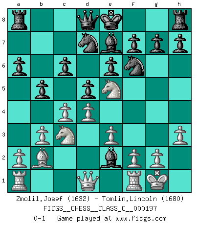 Last move : 0-1 2013 May 20 23:4:8 [Event "FICGS__CHESS__CLASS_C__000197"] [Site "FICGS"] [Date "2013.02.02"] [Round "1"] [White "Zmolil,Josef"] [Black "Tomlin,Lincoln"] [Result "0-1"] [WhiteElo "1632"] [BlackElo "1680"] 1.d4 d5 2.c4 c6 3.Nf3 Nf6 4.Nc3 a6 5.e3 b5 6.b3 Bg4 7.Be2 e6 8.O-O Nbd7 9.h3 Bh5 10.Bb2 Be7 11.Ne5 Bxe2 0-1 This chess game has been lost on time (started : 2013.02.02 11:15:46) QGD Slav : 4.Nc3 Kingside Castling by player White (move 8) Player Black won this chess game. Follow this game move after move (download)Examine moves that smite! A good eye for smites is far more important than a knowledge of strategical principles. (Purdy) Privat ist Kortschnoi kein schlechter Mensch, sehr sympathisch. Aber während des Spiels ist er grausam. Er will dich töten. (Miguel Najdorf) Cada Peón es potencialmente una Reina. (James Mason) Toutes les manuvres exécutées sur une colonne ouverte ont pour but ultime l'intrusion définitive sur la septième ou la huitième rangée, en plein cur de la position ennemie. (Aaron Nimzovitch) How many people work in NATO Headquarters ? - About half of them. (Dirk Stikker, NATO general secretary)