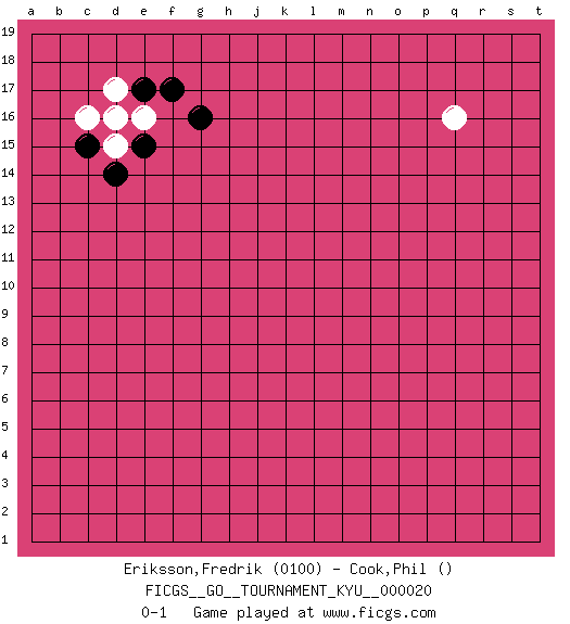 Last move : 0-1 2007 March 3 6:24:16 [Event "FICGS__GO__TOURNAMENT_KYU__000020"] [Site "FICGS"] [Date "2007.01.25"] [Round "1"] [Black "Eriksson,Fredrik"] [White "Cook,Phil"] [Result "0-1"] [Rating 1 "0100"] 1.e15 d17 2.g16 c16 3.c15 d15 4.d14 d16 5.e17 e16 6.f17 q16 0-1 This go game has been lost on time (started : 2007.01.25 18:56:11) Here are the names of the openings (joseki) played in the four corners : Corner d16 : e15 d17 Go-no-go (Wu~wu~) 5-5 Point. The 5-5 was experimented with briefly during the "New Fuseki" movement in Japan in the 1930s. The 5-5 point has not retained popularity because the 4-4 hoshi (star) point strikes a better balance between influence and territory. As one can see from the variations, though, the 5-5 is playable. Komoku. Black continues with 3-5, 4-3 or 3-6. Player White won this Go (weiqi, baduk) game. Follow this game move after move (download)Nothing requires doing this or that, but necessity exists. (Pierre Audouard) Those who make the worst use of their time are the first to complain of its brevity. (Jean de la Bruyere)