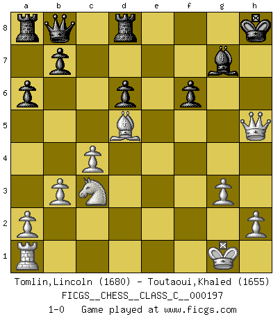 Last move : 1-0 2013 February 18 8:42:25 [Event "FICGS__CHESS__CLASS_C__000197"] [Site "FICGS"] [Date "2013.02.02"] [Round "1"] [White "Tomlin,Lincoln"] [Black "Toutaoui,Khaled"] [Result "1-0"] [WhiteElo "1680"] [BlackElo "1655"] 1.c4 c5 2.g3 Nf6 3.Bg2 d6 4.Nc3 e6 5.Nf3 Nc6 6.d4 cxd4 7.Nxd4 Bd7 8.Bg5 Be7 9.O-O O-O 10.Ndb5 Qb8 11.Bxf6 gxf6 12.Qd2 a6 13.Nd4 Ne5 14.b3 Ng6 15.f4 f5 16.e4 fxe4 17.f5 exf5 18.Nxf5 Bxf5 19.Rxf5 f6 20.Bxe4 Rd8 21.Rh5 Bf8 22.Qd5+ Kg7 23.Rxh7+ Kxh7 24.Qh5+ Kg8 25.Qxg6+ Bg7 26.Bd5+ Kh8 27.Qh5+ 1-0 English : Symmetrical variation Kingside Castling by player White (move 9) Kingside Castling by player Black (move 9) Player White won this chess game. Follow this game move after move (download)When in doubt... play Chess ! (Tevis) Gewinnen beim Schach fördert das Selbstvertrauen. Beim Sex spüre ich sowas nicht... (Garry Kasparov) Solo puedes ser bueno en el Ajedrez si amas al juego. (Bobby Fischer) La vérité est comme le meilleur coup aux échecs : elle existe, mais il faut la chercher. (Arturo Perez-Reverte) If you lose the game you should win the analysis! (Proverb)
