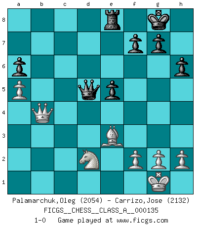 Last move : 1-0 2013 August 28 0:53:5 [Event "FICGS__CHESS__CLASS_A__000135"] [Site "FICGS"] [Date "2013.02.02"] [Round "1"] [White "Palamarchuk,Oleg"] [Black "Carrizo,Jose"] [Result "1-0"] [WhiteElo "2054"] [BlackElo "2132"] 1.e4 e5 2.Nf3 Nc6 3.Bb5 a6 4.Ba4 Nf6 5.d3 Bd6 6.O-O O-O 7.c3 Re8 8.Be3 b5 9.Bb3 h6 10.Nbd2 Bf8 11.a4 b4 12.d4 bxc3 13.bxc3 exd4 14.cxd4 d6 15.a5 Nb4 16.d5 Bd7 17.Rc1 Rb8 18.Rc4 Ng4 19.Bd4 Ne5 20.Nxe5 dxe5 21.Ba7 Rb7 22.Be3 Bb5 23.Ba4 Qd7 24.Bxb5 Qxb5 25.Qg4 c6 26.Rb1 cxd5 27.exd5 Qxd5 28.Rcxb4 Bxb4 29.Rxb4 Rxb4 30.Qxb4 1-0 This chess game has been lost on time (started : 2013.02.02 17:44:16) Ruy Lopez : Anderssen variation Kingside Castling by player White (move 6) Kingside Castling by player Black (move 6) Player White won this chess game. Follow this game move after move (download)Chess is a beautiful mistress. (Bent Larsen) Ein bischen Romantik kann weder im Schach noch in der Liebe schaden. Also versuche ich mich ab und zu daran zu erinnern. (Nigel Short) El Ajedrez era la lengua materna de Capablanca. (Reti) Si je n'étais pas joueur d'échecs, je serais le meilleur dans quelque chose d'autre. (Anatoli Karpov) May the force be with you. (Han Solo in Star Wars ep.4)