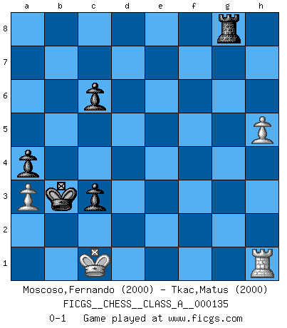 Last move : 0-1 2014 February 27 0:42:41 [Event "FICGS__CHESS__CLASS_A__000135"] [Site "FICGS"] [Date "2013.02.02"] [Round "1"] [White "Moscoso,Fernando"] [Black "Tkac,Matus"] [Result "0-1"] [WhiteElo "2000"] [BlackElo "2000"] 1.e4 c5 2.Nf3 Qc7 3.d4 cxd4 4.Nxd4 a6 5.Nc3 e6 6.Bd3 Nf6 7.O-O Bd6 8.Kh1 Nc6 9.Nxc6 dxc6 10.Bg5 Bd7 11.f4 h6 12.Bxf6 gxf6 13.e5 fxe5 14.fxe5 Bxe5 15.Qh5 O-O-O 16.Rxf7 Rhf8 17.Rh7 c5 18.Re1 c4 19.Be4 Qc5 20.Bf3 Rf5 21.Qh4 Bc6 22.Bxc6 Qxc6 23.Qe4 Rd2 24.Qxc6+ bxc6 25.Rxh6 Rxc2 26.Na4 Bxb2 27.Rhxe6 Kc7 28.Nxb2 Rxb2 29.Rc1 Rf4 30.a3 Rd4 31.R6e1 Kb6 32.Rg1 Kb5 33.g4 a5 34.g5 Rh4 35.Rg2 Rxg2 36.Kxg2 Rg4+ 37.Kf3 Rxg5 38.h4 Rh5 39.Kg4 Rh8 40.h5 Kc5 41.Kf3 a4 42.Rh1 c3 43.Ke2 Kc4 44.Kd1 Kb3 45.Kc1 Rg8 0-1 Sicilian : Quinteros variation Kingside Castling by player White (move 7) Queenside Castling by player Black (move 15) 10 pieces endgame at move 36 : White KRPPP , Black KRPPP WHITE : King + 1 Rook 3 Pawns BLACK : King + 1 Rook 3 Pawns 9 pieces endgame at move 37 : White KRPP , Black KRPPP WHITE : King + 1 Rook 2 Pawns BLACK : King + 1 Rook 3 Pawns Player Black won this chess game. Follow this game move after move (download)The enormous mental resilience, without which no Chess player can exist, was so much taken up by Chess that he could never free his mind of this game. (Albert Einstein) Ein Gewinn durch eine ungenaue Kombination, sei sie auch noch so vorzeigbar, erfüllt mich mit Schaudern. (Wilhelm Steinitz) Hasta este punto, las blancas han seguido un análisis bien conocido. Pero ahora el hace un error fatal: empieza a usar su propia cabeza. (Siegbert Tarrasch) La conception d'un plan est le processus par lequel un joueur exploite les avantages de sa position tout en s'efforçant d'en réduire au minimum les inconvénients. Afin de garantir le succès, un plan doit toujours se fonder sur un diagnostic objectif des particularités d'une position. La conception d'un plan est d'autant plus difficile que la position est équilibrée, et grandement facilitée lorsqu'il n'existe qu'un seul plan susceptible de répondre aux exigences de la position. (Harry Golombek) There are two major products that came out of Berkeley: LSD and UNIX. We do not believe this is to be a coincidence. (Jeremy S. Anderson)