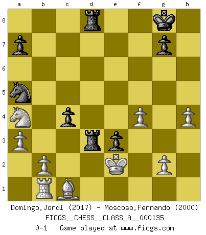 Last move : 0-1 2014 February 3 19:31:32 [Event "FICGS__CHESS__CLASS_A__000135"] [Site "FICGS"] [Date "2013.02.02"] [Round "1"] [White "Domingo,Jordi"] [Black "Moscoso,Fernando"] [Result "0-1"] [WhiteElo "2017"] [BlackElo "2000"] 1.e4 e5 2.Nf3 Nc6 3.Bc4 Nf6 4.Ng5 d5 5.exd5 Na5 6.Bb5+ c6 7.dxc6 bxc6 8.Bd3 Nd5 9.Nf3 Bd6 10.O-O Qc7 11.Re1 O-O 12.c4 Nf4 13.Bc2 Bg4 14.Bxh7+ Kh8 15.Bc2 e4 16.Rxe4 f5 17.Re3 Nxc4 18.Qf1 Qf7 19.Bd1 Rad8 20.Nc3 Nxe3 21.dxe3 Nd3 22.Nd4 Bxd1 23.Qxd1 Ne5 24.Qb3 c5 25.Qxf7 Rxf7 26.Ne6 Re8 27.Nf4 Rd7 28.h4 c4 29.Kf1 Nc6 30.Nfd5 Be5 31.Ke2 Red8 32.f4 Bxc3 33.Nxc3 Rd3 34.Rb1 Kg8 35.a3 Na5 36.e4 fxe4 37.Na4 e3 0-1 Two knights defense Kingside Castling by player White (move 10) Kingside Castling by player Black (move 11) Player Black won this chess game. Follow this game move after move (download)Nonsense was the last thing Fischer was interested in, as far as Chess was concerned. (Elie Agur) Was ist der Unterschied zwischen einem Strassenarbeiter und einem Schachspieler? --Der Schachspieler bewegt sich ab und zu. (Anonymous) Todo se encuentra en un estado de flujo y esto incluye al mundo del Ajedrez. (Mikhail Botvinnik) Les Echecs sont affaire de jugement sensible. Savoir quand frapper et quand esquiver. (Fischer) Somehow our devils are never quite what we expect when we meet them face to face. (Nelson DeMille)