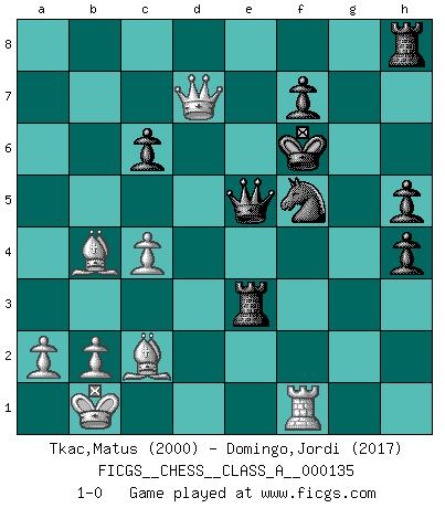 Last move : 1-0 2013 December 14 18:25:12 [Event "FICGS__CHESS__CLASS_A__000135"] [Site "FICGS"] [Date "2013.02.02"] [Round "1"] [White "Tkac,Matus"] [Black "Domingo,Jordi"] [Result "1-0"] [WhiteElo "2000"] [BlackElo "2017"] 1.e4 e5 2.f4 exf4 3.Nf3 d6 4.d4 g5 5.h3 h6 6.Nc3 Bg7 7.Qd3 Ne7 8.Bd2 Nbc6 9.O-O-O Ng6 10.Kb1 Bd7 11.h4 Bg4 12.Nd5 Bxf3 13.gxf3 Nxh4 14.Rxh4 gxh4 15.c3 Ne7 16.Nxf4 h5 17.Bh3 c6 18.Ng2 Bf6 19.Qe2 Ng6 20.f4 Qe7 21.Qf3 Bg7 22.Ne3 Qf6 23.Bf5 Rd8 24.e5 dxe5 25.fxe5 Qg5 26.Bc2 Bxe5 27.dxe5 Qg3 28.Qf6 Qxe5 29.Qf2 Qg3 30.Qe2 Qe5 31.Rf1 Rd7 32.c4 Re7 33.Qd1 Qh2 34.Bb4 Rxe3 35.Qd4 Qe5 36.Qxa7 Ne7 37.Qa8+ Kd7 38.Qxb7+ Ke8 39.Qa8+ Kd7 40.Rd1+ Ke6 41.Qa7 Nf5 42.Qd7+ Kf6 43.Rf1 1-0 KGA : Fischer defense Queenside Castling by player White (move 9) Player White won this chess game. Follow this game move after move (download)Do you realize Fischer almost never has any bad pieces? He exchanges them, and the bad pieces remain with his opponents. (Yuri Balashov) Obwohl ich alt bin, darf mir niemand den Finger in den Mund stecken, sonst beisse ich. (Wilhelm Steinitz) Bendita sea la memoria de aquel que dio al mundo este juego inmortal. (A. G. Gardiner) Les Cavaliers se révèlent fort utiles dans les positions fermées. D'habitude, les Fous sont un peu plus forts que les Cavaliers dans les positions ouvertes. Qu'on le veuille ou non, il restera toujours des exceptions ! The worth of a book is to be measured by what you can carry away from it. (James Bryce)