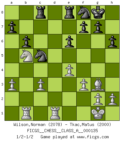 Last move : 1/2-1/2 2013 April 27 10:51:12 [Event "FICGS__CHESS__CLASS_A__000135"] [Site "FICGS"] [Date "2013.02.02"] [Round "1"] [White "Wilson,Norman"] [Black "Tkac,Matus"] [Result "1/2-1/2"] [WhiteElo "2078"] [BlackElo "2000"] 1.d4 Nf6 2.c4 e6 3.Nc3 Bb4 4.e3 O-O 5.Bd3 c5 6.Nge2 d5 7.a3 dxc4 8.Bxc4 Bxc3+ 9.bxc3 b6 10.O-O Bb7 11.f3 Nc6 12.e4 Rc8 13.Qd3 Na5 14.Ba2 h6 15.Bf4 Re8 16.Bg3 Qd7 17.Bb1 Nh7 18.Rd1 Nf8 19.dxc5 Qxd3 20.Bxd3 Nb3 21.Rab1 Nxc5 22.Bb5 Bc6 23.Bxc6 Rxc6 24.Nd4 R6c8 25.Nb5 1/2-1/2 Nimzo-Indian : 4.e3 O-O, 5.Bd3 Kingside Castling by player Black (move 4) Kingside Castling by player White (move 10) This chess game ended in a draw. Follow this game move after move (download)Chess is a sea in which a gnat may drink and an elephant may bathe. (Hindu proverb) Am wohlsten fühle ich mich, wenn ich sehe, wie sich mein Gegner im Todeskampf windet. (Robert James Fischer) Un entendimiento minucioso de las típicas continuaciones de mate hacen de las mas complicadas combinaciones de sacrificio que conducen hacia ellas no solo no dificiles, sino casi un asunto de rutina. (Siegbert Tarrasch) Un footballeur joue avec ses pieds, parfois avec sa tête. Un joueur d'échecs ne joue qu'avec sa tête. Et quand il ne joue plus, il meurt. (Jacob Murray) First of all, we have to go back to the classical time control. (Anatoly Karpov)