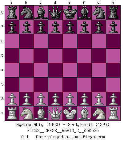 Last move : 0-1 2007 February 25 17:50:58 [Event "FICGS__CHESS__RAPID_C__000020"] [Site "FICGS"] [Date "2007.01.26"] [Round "1"] [White "Ayalew,Abiy"] [Black "Sert,Ferdi"] [Result "0-1"] [WhiteElo "1400"] [BlackElo "1397"] 0-1 This chess game has been lost on time (started : 2007.01.26 15:32:5) Player Black won this chess game. Follow this game move after move (download)Look at Garry Kasparov. After he loses, invariably he wins the next game. He just kills the next guy. That's something that we have to learn to be able to do. (Maurice Ashley) Ich könnte leicht behaupten: Ja,ja, Leonid Breschnew wollte nicht, daß ich Weltmeister werde. In der Tat war die Sache komplizierter. (Viktor Kortschnoi) Bobby solo arroja las piezas y solas caen en las casillas correctas. (Miguel Najdorf ) Des combinaisons [dans le jeu d'échecs] pareilles à des mélodies. Je crois entendre pour ainsi dire la musique des coups... (Vladimir Nabokov) It is not true that people stop pursuing dreams because they grow old, they grow old because they stop pursuing dreams. (Gabriel Garcia Marquez)