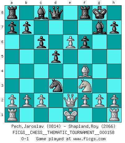 Last move : 0-1 2013 May 22 23:12:44 [Event "FICGS__CHESS__THEMATIC_TOURNAMENT__000158"] [Site "FICGS"] [Date "2013.02.02"] [Round "1"] [White "Pech,Jaroslav"] [Black "Shapland,Roy"] [Result "0-1"] [WhiteElo "0814"] [BlackElo "2066"] 1.e4 e5 2.Nf3 Nc6 3.Bb5 f5 4.Nc3 fxe4 5.Nxe4 Nf6 6.Qe2 d5 7.Nxf6+ gxf6 8.d4 Bg7 9.dxe5 O-O 10.e6 Ne5 11.Bf4 c6 12.Bd3 Nxd3+ 0-1 This chess game has been lost on time (started : 2013.02.02 21:3:44) Ruy Lopez : Schliemann defense, Berger variation Kingside Castling by player Black (move 9) Player Black won this chess game. Follow this game move after move (download)I am still a victim of Chess. It has all the beauty of art and much more. It cannot be commercialized. Chess is much purer than art in its social position. (Marcel Duchamp) Offensichtlich kennt Kasparow nichts anderes als Schach, und ich könnte 500 weitere Spieler dieser Sorte benennen. (Judith Polgar) Con o sin el título, Bobby Fischer fue sin lugar a dudas el mas grande jugador de su época. (Burt Hochberg) Si je n'étais pas joueur d'échecs, je serais le meilleur dans quelque chose d'autre. (Anatoli Karpov) I think your argument is specious - I think your tie is ugly. (Gregory House to Dr. Foreman, House M.D.)