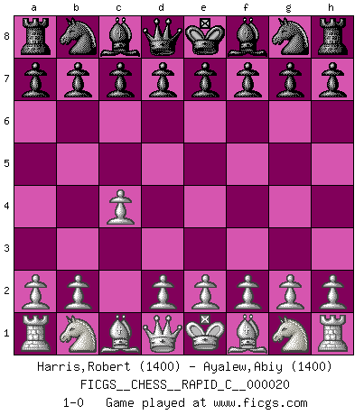 Last move : 1-0 2007 February 25 17:50:58 [Event "FICGS__CHESS__RAPID_C__000020"] [Site "FICGS"] [Date "2007.01.26"] [Round "1"] [White "Harris,Robert"] [Black "Ayalew,Abiy"] [Result "1-0"] [WhiteElo "1400"] [BlackElo "1400"] 1.c4 1-0 This chess game has been lost on time (started : 2007.01.26 15:32:5) English Opening Player White won this chess game. Follow this game move after move (download)Is Bobby Fischer quite sane ? (Salo Flohr) Immer nach dem besten Zug zu suchen ist ziemlich unpraktisch. (Nigel Short) Buenas posiciones no logran ganar juegos, buenas movidas sí. (Gerald Abrahams) La victoire dans une partie d'Echecs appartient la plupart du temps à celui qui voit un peu plus loin que l'adversaire. (Lasker) Luck is what you have left over after you give 100 percent. (Langston Coleman)