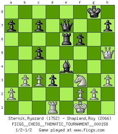 Last move : 1/2-1/2 2013 March 17 13:18:56 [Event "FICGS__CHESS__THEMATIC_TOURNAMENT__000158"] [Site "FICGS"] [Date "2013.02.02"] [Round "1"] [White "Sternik,Ryszard"] [Black "Shapland,Roy"] [Result "1/2-1/2"] [WhiteElo "1752"] [BlackElo "2066"] 1.e4 e5 2.Nf3 Nc6 3.Bb5 f5 4.Nc3 fxe4 5.Nxe4 Nf6 6.Qe2 d5 7.Nxf6+ gxf6 8.d4 Bg7 9.dxe5 O-O 10.Bxc6 bxc6 11.e6 Re8 12.O-O c5 13.Qb5 Bf8 14.Be3 Rxe6 15.Qd3 Ba6 16.Qf5 Qd7 17.Rfd1 Rd6 18.Qh5 d4 19.Bf4 Re6 20.Re1 Rae8 21.Rxe6 Rxe6 22.Bh6 Bxh6 23.Qxh6 Bb7 24.Qh5 Qe7 25.h3 Qg7 26.Kf1 Qe7 27.Rd1 Be4 28.c3 d3 29.b3 1/2-1/2 Ruy Lopez : Schliemann defense, Berger variation Kingside Castling by player Black (move 9) Kingside Castling by player White (move 12) This chess game ended in a draw. Follow this game move after move (download)Weak points or holes in the opponent's position must be occupied by pieces not Pawns. (Siegbert Tarrasch) Zum Sieg gelangt man nicht, wenn man gut, sondern nur wenn man besser spielt (Savielly Grigorievitsch Tartakower) Si pudieramos observar el interior de la cabeza de un jugador de Ajedrez, encontraríamos ahí un mundo lleno de sentimientos, imágenes, ideas, emoción y pasión. (Alfred Binet) Le thème de l'attaque double intervient d'une manière ou d'une autre dans l'immense majorité des combinaisons. (Youri Averbakh) When you stop learning you start dying. (M. Scott Adams)