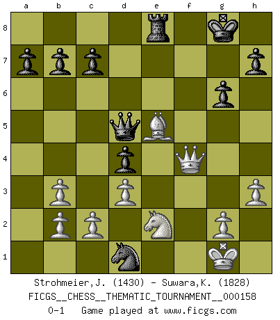 Last move : 0-1 2013 June 27 19:16:24 [Event "FICGS__CHESS__THEMATIC_TOURNAMENT__000158"] [Site "FICGS"] [Date "2013.02.02"] [Round "1"] [White "Strohmeier,Josef"] [Black "Suwara,Kazimierz"] [Result "0-1"] [WhiteElo "1430"] [BlackElo "1828"] 1.e4 e5 2.Nf3 Nc6 3.Bb5 f5 4.Nc3 Nf6 5.exf5 Bc5 6.O-O O-O 7.d3 Nd4 8.Nxe5 d6 9.Bc4+ d5 10.Bb3 Nxb3 11.axb3 Bxf5 12.Bg5 Bd4 13.Nf3 Bg4 14.h3 Bxf3 15.Qxf3 Qd7 16.Ra4 Ne4 17.Qh5 Bxf2+ 18.Rxf2 Nxf2 19.Rh4 g6 20.Qh6 Rf5 21.Be3 Raf8 22.Rf4 Rxf4 23.Bxf4 d4 24.Ne2 Nd1 25.Be5 Re8 26.Qf4 Qd5 0-1 Ruy Lopez : Schliemann defense, Berger variation Kingside Castling by player White (move 6) Kingside Castling by player Black (move 6) Player Black won this chess game. Follow this game move after move (download)If one piece is badly posted, the whole game is bad. (Tarrasch) Früher wurde jeder komplizierte Zug, jedes interessante Opfer mit großem Beifall und Enthusiasmus aufgenommen. Heute schaltet man einfach seinen Fritz an, und man kann sehen, was los ist, ob der Zug geht oder nicht. (Vladimir Kramnik) Bobby Fischer es el mas grande genio de Ajedrez de todos los tiempos. (Alexander Kotov) Un journaliste : 'Vous préférez avoir une dame de plus sur l'échiquier ou au lit ?' Boris Spassky : 'Ca dépend de la position.' The production of too many useful things results in too many useless people. (Karl Marx)