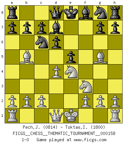 Last move : 1-0 2013 May 5 21:53:4 [Event "FICGS__CHESS__THEMATIC_TOURNAMENT__000158"] [Site "FICGS"] [Date "2013.02.02"] [Round "1"] [White "Pech,Jaroslav"] [Black "Toktas,Ibrahim Ugras"] [Result "1-0"] [WhiteElo "0814"] [BlackElo "1800"] 1.e4 e5 2.Nf3 Nc6 3.Bb5 f5 4.Nc3 fxe4 5.Nxe4 d6 6.d4 Bd7 7.Bg5 1-0 This chess game has been lost on time (started : 2013.02.02 21:3:44) Ruy Lopez : Schliemann defense, Berger variation Player White won this chess game. Follow this game move after move (download)In Chess, at least, the brave inherit the earth. (Edmar Mednis) Woher wissen wir, daß der Neanderthaler Blindschach gespielt hat? -- Bei Ausgrabungen wurden keine Schachbretter und Figuren gefunden. (Anonymous) Aquellos que dicen que entienden al Ajedrez, no entienden nada. (Robert Hubner) Le génie consiste à savoir transgresser les règles au moment opportun. (Teichmann) I've lost money so fast in these clubs it's left me reeling. I've read every poker book ever written, but the only way to get better at the game is to go out and play with people who are really good. The problem is, you stand to lose a lot of money doing it. (Matt Damon)