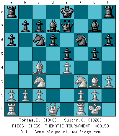 Last move : 0-1 2013 May 22 23:12:44 [Event "FICGS__CHESS__THEMATIC_TOURNAMENT__000158"] [Site "FICGS"] [Date "2013.02.02"] [Round "1"] [White "Toktas,Ibrahim Ugras"] [Black "Suwara,Kazimierz"] [Result "0-1"] [WhiteElo "1800"] [BlackElo "1828"] 1.e4 e5 2.Nf3 Nc6 3.Bb5 f5 4.d3 fxe4 5.dxe4 Nf6 6.Bg5 h6 7.Bh4 g5 8.Bg3 d6 9.O-O Bd7 10.Nc3 Bg7 11.h3 a6 12.Bc4 Qe7 0-1 Ruy Lopez : Schliemann defense Kingside Castling by player White (move 9) Player Black won this chess game. Follow this game move after move (download)Chess, like love, is infectious at any age. (Flohr) Ich verlor meine Bürgerrechte, mein Gehalt wurde mir nicht mehr bezahlt und ich wurde zensiert und durfte nicht mehr ins Ausland reisen. [nach dem Match Fischer-Taimanov 6:0] (Mark Taimanov) No hay otro maestro que tenga una voluntad terrífica de ganar. Al tablero, el irradía peligro y aún los oponentes mas fuertes tienden a congelarse como liebres cuando olfatean a una pantera. Aún sus debilidades son peligrosas. Con las blancas, su juego de apertura es predecible - te es posible hacer planes en su contra - pero es tan fuerte que tus planes casi nunca funcionan. En el juego medio, su precisión e invención son fabulosas y en finales, tú simplemente no le puedes vencer. (Experto Alemán anónimo) On croit qu'il y a plus de mauvais joueurs que de bons joueurs, c'est faux : Il y a autant de joueurs qui gagnent que de joueurs qui perdent. (Philippe Geluck) Strategy without tactics is the slowest route to victory. Tactics without strategy is the noise before defeat. (Sun Tzu)