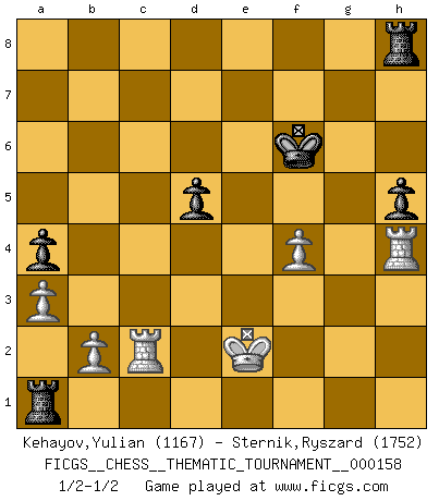 Last move : 1/2-1/2 2013 February 21 18:33:43 [Event "FICGS__CHESS__THEMATIC_TOURNAMENT__000158"] [Site "FICGS"] [Date "2013.02.02"] [Round "1"] [White "Kehayov,Yulian"] [Black "Sternik,Ryszard"] [Result "1/2-1/2"] [WhiteElo "1167"] [BlackElo "1752"] 1.e4 e5 2.Nf3 Nc6 3.Bb5 f5 4.Nc3 fxe4 5.Nxe4 Nf6 6.Nxf6+ gxf6 7.d4 Bg7 8.dxe5 O-O 9.exf6 Qxf6 10.O-O d6 11.Bxc6 bxc6 12.c3 Bg4 13.h3 Bxf3 14.Qxf3 Qxf3 15.gxf3 Rxf3 16.Kg2 Rf5 17.Be3 a5 18.Rae1 Kf7 19.f4 a4 20.Bd4 Bxd4 21.cxd4 Rd5 22.Rc1 Rxd4 23.Rxc6 Kf6 24.Rxc7 Rg8+ 25.Kf3 Rd3+ 26.Kf2 Rb8 27.Rb1 h5 28.Rc2 Rxh3 29.Kg2 Rd3 30.Rh1 Rh8 31.Rh4 d5 32.Kf2 Rd1 33.Ke2 Rg1 34.Kf3 Rf1+ 35.Ke2 Ra1 36.a3 1/2-1/2 Ruy Lopez : Schliemann defense, Berger variation Kingside Castling by player Black (move 8) Kingside Castling by player White (move 10) This chess game ended in a draw. Follow this game move after move (download)We like to think. (Gary Kasparov) Im Blitz ist es einfacher mit einer Figur weniger anzugreifen, als sich mit einer Mehrfigur zu verteidigen. (Mikhail Nekhemyevich Tal) El Ajedrez, como cualquier otra actividad creativa, puede existir solo a través de méritos combinados de aquellos que tienen talento creativo y de aquellos que tienen la habilidad de organizar un trabajo creativo. (Mikhail Botvinnik) Horreur, mais aussi harmonie suprême : qu'y avait-il en effet au monde en dehors des échecs ? Le brouillard, l'inconnu, le non-être... (Vladimir Nabokov) Rules and bones are meant to be broken. (Anonymous)