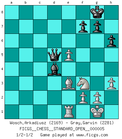 Last move : 1/2-1/2 2013 October 14 10:49:27 [Event "FICGS__CHESS__STANDARD_OPEN__000005"] [Site "FICGS"] [Date "2013.02.03"] [Round "2"] [White "Wosch,Arkadiusz"] [Black "Gray,Garvin"] [Result "1/2-1/2"] [WhiteElo "2169"] [BlackElo "2281"] 1.e4 e5 2.Nf3 Nc6 3.Bc4 Nf6 4.d3 Be7 5.O-O O-O 6.Re1 d6 7.a4 a6 8.a5 Be6 9.Nbd2 Qd7 10.c3 h6 11.Bxe6 Qxe6 12.d4 exd4 13.Nxd4 Nxd4 14.cxd4 Rae8 15.h3 d5 16.e5 Nd7 17.Nf3 Rc8 18.Qa4 c5 19.Bd2 c4 20.Re3 Rfd8 21.b3 b6 22.axb6 Nxb6 23.Qa2 Rc6 24.Qxa6 Ra8 25.Qxa8+ Nxa8 26.Rxa8+ Rc8 27.Rxc8+ Qxc8 28.bxc4 dxc4 29.d5 Bc5 30.Re4 Qa6 31.d6 Qb5 32.d7 Qxd7 33.Rxc4 Qd5 34.Rc1 Kh7 35.Re1 Bd4 36.Bf4 Kg8 37.Be3 1/2-1/2 Two knights defense (Modern Bishop's Opening) Kingside Castling by player White (move 5) Kingside Castling by player Black (move 5) This chess game ended in a draw. Follow this game move after move (download)The Pin is mightier than the sword. (Fred Reinfeld) Versuche, dich von der Sklaverei der Eröffnungsvarianten zu befreien. Stattdessen soll man gewisse Typenpositionen erlernen, die man eingehend analysiert. (Aaron Nimzowitsch) Con el fin de mejorar tu juego, debes de estudiar los finales antes que todo, ya que mientras que los finales pueden ser estudiados y dominados por sí mismos, el juegomedio y la apertura deben de ser estudiados en relación con los finales. (José Raúl Capablanca) Une platitude souvent récitée à propos des Echecs est qu'une des choses les plus difficiles à réaliser est de gagner une position gagnante. Cela ne manque pas de sens mais, pour ma part, j'ai toujours trouvé plus difficile de gagner une position perdante. (Tim Krabbe) No, no, you're not thinking; you're just being logical. (Niels Bohr)