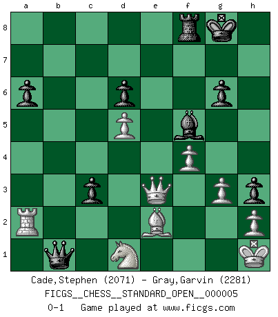 Last move : 0-1 2013 June 13 17:31:1 [Event "FICGS__CHESS__STANDARD_OPEN__000005"] [Site "FICGS"] [Date "2013.02.03"] [Round "1"] [White "Cade,Stephen"] [Black "Gray,Garvin"] [Result "0-1"] [WhiteElo "2071"] [BlackElo "2281"] 1.d4 Nf6 2.c4 e6 3.Nc3 c5 4.d5 exd5 5.cxd5 d6 6.e4 g6 7.Nge2 Bg7 8.Ng3 h5 9.Be2 h4 10.Nf1 h3 11.g3 O-O 12.Bg5 Nbd7 13.Nd2 Re8 14.a4 a6 15.a5 b6 16.axb6 Qxb6 17.Ra3 Rb8 18.Rb3 Qc7 19.O-O Rb4 20.Qc2 Ne5 21.Bf4 Neg4 22.Ra1 Nh5 23.Bg5 f6 24.Be3 Nxe3 25.fxe3 f5 26.Rxb4 cxb4 27.Qa4 Rf8 28.Nd1 f4 29.exf4 Bxb2 30.Ra2 Qb6+ 31.Kh1 Bc3 32.Nb1 Nf6 33.Nbxc3 bxc3 34.Qc2 Nxe4 35.Qxe4 Bf5 36.Qe3 Qb1 0-1 Alvin Alcala Garvin you are awesome! Garvin Gray Yes I am bahahaha lol Queen's pawn game Kingside Castling by player Black (move 11) Kingside Castling by player White (move 19) Player Black won this chess game. Follow this game move after move (download)Human affairs are like a Chess game: only those who do not take it seriously can be called good players. (Hung Tzu Ch'eng) Der Knackpunkt bei der Konzentration ist, daß wir nur durch sie etwas Neues und Ungewöhnliches am Schachbrett finden können. Sie ist der einzige Weg durch neue neue Ideen eine Überraschung zu bereiten. (Garry Kasparov) Una compensación adecuada por un sacrificio es tener una combinación sólida que conduce a una posición ganadora; una compensación adecuada por una metida de pata es dejar a tu oponente arrebatar una derrota de las fauces de la victoria. (Bruce A. Moon) Dieu déplace le joueur, et celui-ci la pièce. Quel Dieu derrière Dieu commence donc la trame ? Arturo Perez-Reverte (prix de littérature policière 1993). What doesn't kill us makes us stronger. (Friedrich Nietzsche)