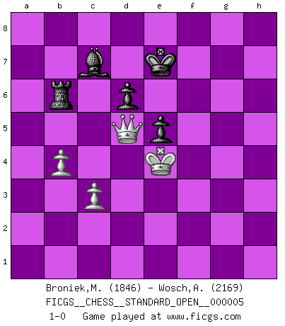 Last move : 1-0 2013 November 15 6:40:24 [Event "FICGS__CHESS__STANDARD_OPEN__000005"] [Site "FICGS"] [Date "2013.02.03"] [Round "1"] [White "Broniek,Mariusz Maciej"] [Black "Wosch,Arkadiusz"] [Result "1-0"] [WhiteElo "1846"] [BlackElo "2169"] 1.e4 c5 2.Nf3 Nc6 3.d4 cxd4 4.Nxd4 Nf6 5.Nc3 d6 6.Bg5 e6 7.Qd2 a6 8.O-O-O Bd7 9.f4 b5 10.Bxf6 gxf6 11.Kb1 Qb6 12.Nxc6 Bxc6 13.f5 Qc5 14.Bd3 h5 15.Qe1 Be7 16.Qg3 Kd7 17.Rhf1 Rag8 18.Qh3 Rg4 19.Be2 Rg5 20.Bf3 Rc8 21.Rd2 Qe5 22.Re2 a5 23.Nd5 Bd8 24.g3 Bxd5 25.exd5 Qxf5 26.dxe6+ fxe6 27.Bc6+ Rxc6 28.Rxf5 Rxf5 29.a4 R6c5 30.g4 hxg4 31.Qxg4 Rc4 32.Qg7+ Be7 33.Qg1 bxa4 34.Qa7+ Rc7 35.Qd4 Rc6 36.Qxa4 Rfc5 37.h4 Rc4 38.Qxa5 Rxh4 39.Qe1 Rh5 40.Rxe6 Re5 41.Rxe5 fxe5 42.Qe4 Bd8 43.b4 Rb6 44.c3 Kc7 45.Qd5 Kd7 46.Kc2 Bc7 47.Kd3 Ke7 48.Ke4 1-0 Sicilian defense Queenside Castling by player White (move 8) 10 pieces endgame at move 41 : White KQRPP , Black KRBPP WHITE : King + 1 Queen 1 Rook 2 Pawns BLACK : King + 1 Rook 1 Bishop 2 Pawns 9 pieces endgame at move 41 : White KQPP , Black KRBPP WHITE : King + 1 Queen 2 Pawns BLACK : King + 1 Rook 1 Bishop 2 Pawns Player White won this chess game. Follow this game move after move (download)Discovered check is the dive bomber of the Chessboard. (Reuben Fine) Obwohl ich alt bin, darf mir niemand den Finger in den Mund stecken, sonst beisse ich. (Wilhelm Steinitz) Debemos de asegurarnos de que el Ajedrez no se convierta en un lenguaje muerto, muy interesante, pero solo para un grupo muy pequeño. (Sytze Faber) On n'a jamais que l'âge auquel on a commence à jouer aux échecs car après on cesse de vieillir. (Capablanca) A journey of a thousand sites begins with a single click. (Author unknown)