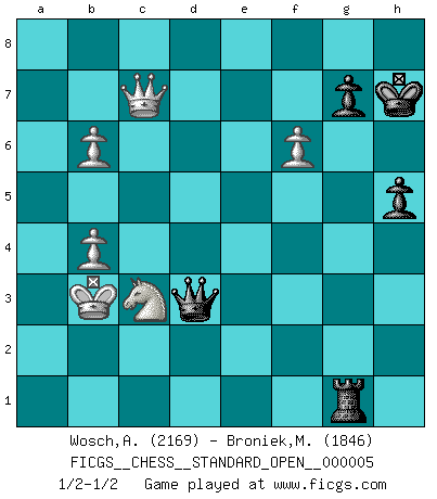Last move : 1/2-1/2 2013 September 17 16:46:49 [Event "FICGS__CHESS__STANDARD_OPEN__000005"] [Site "FICGS"] [Date "2013.02.03"] [Round "2"] [White "Wosch,Arkadiusz"] [Black "Broniek,Mariusz Maciej"] [Result "1/2-1/2"] [WhiteElo "2169"] [BlackElo "1846"] 1.e4 c5 2.Nf3 d6 3.d4 Nf6 4.Nc3 cxd4 5.Nxd4 a6 6.Be3 e5 7.Nb3 Be6 8.f3 Be7 9.Qd2 O-O 10.O-O-O Nbd7 11.g4 b5 12.g5 b4 13.Ne2 Ne8 14.f4 a5 15.f5 Bxb3 16.cxb3 a4 17.bxa4 Rxa4 18.b3 Ra5 19.Kb1 d5 20.exd5 Bc5 21.Bxc5 Nxc5 22.Qxb4 Nd6 23.Nc3 Qa8 24.a4 Rb8 25.Bb5 Nxb5 26.axb5 Nd3 27.Rxd3 Ra1+ 28.Kb2 Rxh1 29.Na4 Rxh2+ 30.Ka3 Rc2 31.Rd1 Rb6 32.Re1 h5 33.Rxe5 Qb8 34.Qe4 Qd6+ 35.b4 Rb8 36.Kb3 Rg2 37.Re8+ Rxe8 38.Qxe8+ Kh7 39.Qxf7 Rxg5 40.b6 Rg3+ 41.Nc3 Qe5 42.Qc7 Qxd5+ 43.Ka4 Qd3 44.f6 Rg1 45.Kb3 1/2-1/2 Sicilian Kingside Castling by player Black (move 9) Queenside Castling by player White (move 10) This chess game ended in a draw. Follow this game move after move (download)Pawn endings are to Chess what putting is to golf. (Cecil Purdy) Fischer: 'Remis!?' Uhlmann: 'Aber es muss doch dreimal Zugwiederholung sein!' Fischer: 'Sie nehmen das Remis an, wie ich es sage, sonst spiele ich weiter und werde Sie dann schlagen!' (Robert James Fischer) Aunque la mayoría de la gente disfruta observar las partidas de los grandes Maestros de ataque, algunos de los jugadores mas notables en la historia han sido los jugadores silenciosos posicionales. Lentamente ellos te aplastan despojandote de tu espacio, congestionando tus piezas y dejandote virtualmente sin nada que hacer. (Yasser Seirawan) Mais l'homme est une créature légère et illogique : semblable au joueur d'échecs, il n'aime que le processus du but à atteindre, non le but lui-même. (Dostoïevsky) It is not titles that honor men, but men that honor titles. (Niccolo Machiavelli)