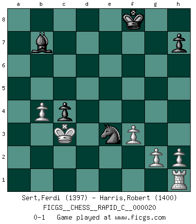 Last move : 0-1 2007 May 7 20:4:11 [Event "FICGS__CHESS__RAPID_C__000020"] [Site "FICGS"] [Date "2007.01.26"] [Round "1"] [White "Sert,Ferdi"] [Black "Harris,Robert"] [Result "0-1"] [WhiteElo "1397"] [BlackElo "1400"] 1.d4 Nf6 2.c4 e6 3.Nc3 Bb4 4.Qc2 O-O 5.Bg5 c5 6.dxc5 Na6 7.a3 Bxc3+ 8.Qxc3 Nxc5 9.Bxf6 Qxf6 10.Qxf6 gxf6 11.O-O-O b6 12.b4 Ne4 13.Nh3 a5 14.Kb2 axb4 15.axb4 Bb7 16.f3 Ra2+ 17.Kxa2 Nc3+ 18.Kb3 Nxd1 19.e4 Ne3 20.Nf4 f5 21.exf5 d5 22.fxe6 fxe6 23.Nxe6 dxc4+ 24.Bxc4 b5 25.Nxf8 bxc4+ 26.Kc3 Kxf8 0-1 This chess game has been lost on time (started : 2007.01.26 15:32:5) Nimzo-Indian : Classical variation Kingside Castling by player Black (move 4) Queenside Castling by player White (move 11) Player Black won this chess game. Follow this game move after move (download)You cannot play at Chess if you are kind-hearted. (French Proverb) Computer sind die einzigen Gegner, die nicht immer eine Ausrede auf Lager haben, wenn sie gegen mich verlieren. (Robert James Fischer) Si no le temes a Spassky, entonces elimino el elemento del dinero. (Jim Slater) Même si vous avez un bon coup à faire, regardez toujours s'il n'y en a pas un qui lui soit préférable. (Pedro Damiano) The production of too many useful things results in too many useless people. (Karl Marx)