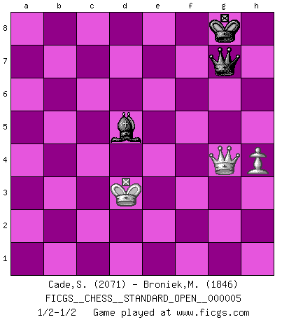 Last move : 1/2-1/2 2013 June 10 11:24:38 [Event "FICGS__CHESS__STANDARD_OPEN__000005"] [Site "FICGS"] [Date "2013.02.03"] [Round "1"] [White "Cade,Stephen"] [Black "Broniek,Mariusz Maciej"] [Result "1/2-1/2"] [WhiteElo "2071"] [BlackElo "1846"] 1.d4 d5 2.c4 Bf5 3.Nc3 e6 4.Nf3 Bb4 5.cxd5 exd5 6.Bf4 Nf6 7.e3 O-O 8.Be2 Ne4 9.Qb3 Nc6 10.O-O Bxc3 11.bxc3 b6 12.h3 Na5 13.Qb4 Re8 14.Rac1 Qe7 15.Rfd1 f6 16.Nd2 Nxd2 17.Rxd2 Rad8 18.g4 Bc8 19.Rb2 g5 20.Bg3 h5 21.gxh5 Qf7 22.c4 Nxc4 23.Rbc2 Be6 24.Qa4 Re7 25.Kh2 Kh8 26.Rc3 Rde8 27.Qd1 f5 28.Qh1 b5 29.Be5+ Nxe5 30.dxe5 f4 31.Qg2 Qf5 32.exf4 d4 33.Rxc7 d3 34.Bxd3 Qxd3 35.fxg5 Qf5 36.h6 Rxc7 37.Rxc7 Rg8 38.h4 a5 39.Rc5 Rc8 40.Rxb5 Rc2 41.Rb8+ Bc8 42.Qg3 Rxf2+ 43.Kg1 Rf1+ 44.Kh2 Kg8 45.g6 a4 46.g7 Rf2+ 47.Kg1 Rc2 48.Rb1 Rc3 49.Qxc3 Qxb1+ 50.Kf2 Qxa2+ 51.Ke1 Bg4 52.Qd3 Qa1+ 53.Kf2 Qb2+ 54.Kf1 Qc1+ 55.Kf2 Qf4+ 56.Kg2 Qxh6 57.Qc4+ Be6 58.Qxa4 Bd5+ 59.Kf2 Qd2+ 60.Kf1 Qg2+ 61.Ke1 Qg3+ 62.Kd2 Qxe5 63.Qg4 Qb2+ 64.Kd3 Qxg7 1/2-1/2 QGD : Grau (Sahovic) defense Kingside Castling by player Black (move 7) Kingside Castling by player White (move 10) 10 pieces endgame at move 50 : White KQPPPP , Black KQBP WHITE : King + 1 Queen 4 Pawns BLACK : King + 1 Queen 1 Bishop 1 Pawn 9 pieces endgame at move 56 : White KQPPP , Black KQBP WHITE : King + 1 Queen 3 Pawns BLACK : King + 1 Queen 1 Bishop 1 Pawn 8 pieces endgame at move 58 : White KQPPP , Black KQB WHITE : King + 1 Queen 3 Pawns BLACK : King + 1 Queen 1 Bishop 7 pieces endgame at move 62 : White KQPP , Black KQB WHITE : King + 1 Queen 2 Pawns BLACK : King + 1 Queen 1 Bishop 6 pieces endgame at move 64 : White KQP , Black KQB WHITE : King + 1 Queen 1 Pawn BLACK : King + 1 Queen 1 Bishop This chess game ended in a draw. Follow this game move after move (download)It is not a move, even the best move that you must seek, but a realizable plan. (Eugene Znosko-Borovsky) Jeder Schachmeister war einmal ein Anfänger. (Irving Chernev) El poder defensivo de una pieza clavada, solamente es imaginario. (Aaron Nimzovich) Aucun coup ne doit être joué sans but. (Pedro Damiano) The absolute truth is the thing that makes people laugh. (Carl Reiner)