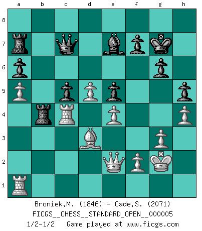 Last move : 1/2-1/2 2013 May 26 23:39:58 [Event "FICGS__CHESS__STANDARD_OPEN__000005"] [Site "FICGS"] [Date "2013.02.03"] [Round "2"] [White "Broniek,Mariusz Maciej"] [Black "Cade,Stephen"] [Result "1/2-1/2"] [WhiteElo "1846"] [BlackElo "2071"] 1.e4 c5 2.Nf3 d6 3.d4 cxd4 4.Nxd4 Nf6 5.Nc3 a6 6.Be3 e5 7.Nb3 Be6 8.Be2 Be7 9.Nd5 Nbd7 10.Qd3 O-O 11.c4 b5 12.Nd2 Nc5 13.Bxc5 dxc5 14.b3 Nxd5 15.cxd5 Bd7 16.O-O Qb6 17.a4 Rfb8 18.Qc3 Bd6 19.h3 Qd8 20.Ra2 g6 21.Rfa1 bxa4 22.bxa4 Rb4 23.Nc4 Bf8 24.a5 Bb5 25.g3 Rb8 26.Rc1 Bh6 27.Re1 Bg7 28.Qc2 Qd7 29.Kg2 Ba4 30.Qc3 Bb3 31.R2a1 Bxc4 32.Bxc4 Qd6 33.Qd3 Ra8 34.h4 h5 35.Rec1 Bf8 36.Qe3 Qd8 37.Bd3 Bd6 38.Qd2 Kg7 39.Qe2 Ra7 40.Rc4 Qc7 41.Ra2 Be7 42.Rc1 Bd6 43.R1c2 Be7 44.Rc4 Bd6 45.Ra1 Be7 1/2-1/2 Sicilian : Najdorf, Byrne (English) attack Kingside Castling by player Black (move 10) Kingside Castling by player White (move 16) This chess game ended in a draw. Follow this game move after move (download)When asked, -How is that you pick better moves than your opponents?, I responded: I'm very glad you asked me that, because, as it happens, there is a very simple answer. I think up my own moves, and I make my opponent think up his. (Alexander Alekhine) Wenn Dein Gegner dir ein Remis anbietet, versuch herauszufinden, weshalb er glaubt schlechter zu stehen. (Nigel Short) Tu eres para mi la Reina en d8 y yo soy el Peón en d7!!. (GM Eduard Gufeld) Le joueur d'Echecs qui veut atteindre le top est obligé de développer son propre credo créatif. Alexeï Stepanovicth Souétine. Il est facile d'écrire des livres ! Ce qui est difficile, c'est de jouer ! (Alexeï Stepanovicth Souétine) Knowledge will give you power, but character respect. (Bruce Lee)