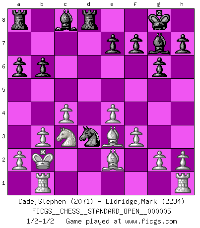 Last move : 1/2-1/2 2013 March 11 11:58:4 [Event "FICGS__CHESS__STANDARD_OPEN__000005"] [Site "FICGS"] [Date "2013.02.03"] [Round "2"] [White "Cade,Stephen"] [Black "Eldridge,Mark"] [Result "1/2-1/2"] [WhiteElo "2071"] [BlackElo "2234"] 1.d4 Nf6 2.c4 g6 3.Nc3 Bg7 4.e4 d6 5.f3 O-O 6.Be3 Nc6 7.Nge2 a6 8.Qd2 Na5 9.Nc1 Nd7 10.Be2 c5 11.dxc5 Ne5 12.b3 dxc5 13.Bxc5 Nac6 14.Rb1 Qxd2+ 15.Kxd2 Rd8+ 16.Kc2 b6 17.Be3 Nb4+ 18.Kb2 Ned3+ 19.Nxd3 Nxd3+ 20.Kc2 Nb4+ 21.Kb2 Nd3+ 1/2-1/2 King's Indian : Saemisch, Panno formation Kingside Castling by player Black (move 5) This chess game ended in a draw. Follow this game move after move (download)The most powerful weapon in Chess is to have the next move. (David Bronstein) Warum muß ich gegen diesen IDIOTEN verlieren? (Aaron Nimzowitsch) Una compensación adecuada por un sacrificio es tener una combinación sólida que conduce a una posición ganadora; una compensación adecuada por una metida de pata es dejar a tu oponente arrebatar una derrota de las fauces de la victoria. (Bruce A. Moon) Echiquier : carré parfait, comme la Jérusalem nouvelle décrite par l'auteur de l'Apocalypse, huit cases sur huit, exaltation du chiffre 4, symbole du cosmos aux quatre horizons... où le noir et le blanc, l'ombre et la lumière, le mal et le bien s'entremêlent et se conjuguent. (Robert Couffignal, Le Gambit du poète) My poor ole parrot... Is not in the circulation of displays ....poo hoo hoo :) (Wayne Lowrance's enigma)