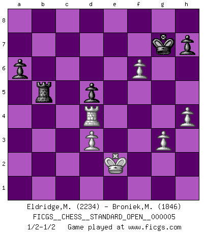 Last move : 1/2-1/2 2013 May 26 22:33:25 [Event "FICGS__CHESS__STANDARD_OPEN__000005"] [Site "FICGS"] [Date "2013.02.03"] [Round "2"] [White "Eldridge,Mark"] [Black "Broniek,Mariusz Maciej"] [Result "1/2-1/2"] [WhiteElo "2234"] [BlackElo "1846"] 1.b3 d5 2.Bb2 e6 3.e3 Nf6 4.f4 c5 5.Nf3 Nc6 6.Bb5 Bd7 7.O-O Qc7 8.Ne5 Be7 9.Nxd7 Qxd7 10.d3 O-O 11.Nd2 a6 12.Bxc6 Qxc6 13.Qf3 b5 14.a4 Rfe8 15.Rfe1 Nd7 16.e4 Bf6 17.Bxf6 Nxf6 18.e5 Nd7 19.c4 bxc4 20.bxc4 Rab8 21.a5 Nf8 22.cxd5 Qxd5 23.Qxd5 exd5 24.Reb1 Ne6 25.g3 g5 26.fxg5 Rxb1+ 27.Rxb1 Nd4 28.Kg2 Rxe5 29.Nf3 Re2+ 30.Kf1 Ra2 31.Nxd4 cxd4 32.Rb4 Kg7 33.h4 Rxa5 34.Ke2 Rb5 35.Rxd4 f6 36.gxf6+ 1/2-1/2 Nimzovich-Larsen attack : Classical variation Kingside Castling by player White (move 7) Kingside Castling by player Black (move 10) This chess game ended in a draw. Follow this game move after move (download)It is peculiar but a fact nevertheless, that gamblers in chess always have enthusiastic followers. (Botvinnik) Wenn man heute mit 14 Jahren noch kein GM ist, kann man es vergessen. (Viswanathan Anand) A través de las casillas del tablero, los Indios explican el movimiento del tiempo y la edad, las influencias mas altas que controlan el mundo y los lazos que vinculan al Ajedrez con el alma humana. (Al-Masudi) Les ravages du H expliquent la différence de niveau entre Tal et Thal [Abergel]. Art is not a thing, it is a way. (Elbert Hubbard)