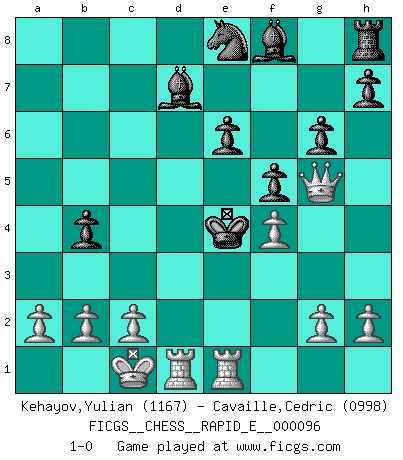 Last move : 1-0 2013 February 16 11:32:10 [Event "FICGS__CHESS__RAPID_E__000096"] [Site "FICGS"] [Date "2013.02.10"] [Round "1"] [White "Kehayov,Yulian"] [Black "Cavaille,Cedric"] [Result "1-0"] [WhiteElo "1167"] [BlackElo "0998"] 1.e4 c5 2.Nc3 d6 3.Nf3 Nf6 4.d4 cxd4 5.Qxd4 Nc6 6.Qa4 e6 7.Bf4 a6 8.e5 b5 9.Bxb5 axb5 10.Qxa8 dxe5 11.Nxe5 Nxe5 12.Bxe5 b4 13.Nb5 Bd7 14.Nc7+ Ke7 15.Bd6+ Kxd6 16.Qxd8 g6 17.Ne8+ Nxe8 18.O-O-O Ke5 19.Qg5+ f5 20.f4+ Ke4 21.Rhe1+ 1-0 Sicilian : Closed Queenside Castling by player White (move 18) Player White won this chess game. Follow this game move after move (download)There is only one thing Fischer does in Chess without pleasure: to lose ! (Boris Spassky) Im Internet Chess Club betrug mein Rating vorübergehend 3350 ELO-Punkte. (Sergej Karjakin) Los finales de Peón son del Ajedrez lo que el cesped es del Golf. (Cecil Purdy) Ne tendez aucun piège pour le plaisir ! Ne jouez rien dans l'espoir que l'adversaire réagisse de façon stupide ! Prenez toujours pour acquis que l'adversaire va trouver le meilleur coup ! Ne jouez jamais de coup dans l'espoir que l'adversaire ne voie pas la menace ! Chacun de vos coups doit améliorer la position d'une façon ou d'une autre. A good programmer is someone who always looks both ways before crossing a one-way street. (Doug Linder)