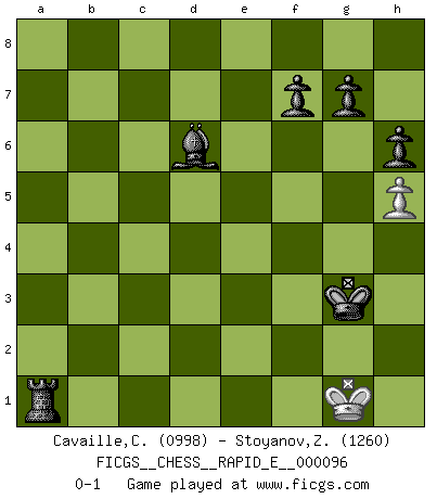 Last move : 0-1 2013 February 10 22:5:10 [Event "FICGS__CHESS__RAPID_E__000096"] [Site "FICGS"] [Date "2013.02.10"] [Round "1"] [White "Cavaille,Cedric"] [Black "Stoyanov,Zdravko"] [Result "0-1"] [WhiteElo "0998"] [BlackElo "1260"] 1.d4 d5 2.Nc3 h6 3.e4 dxe4 4.Nxe4 Qd5 5.Qd3 Bf5 6.f3 Qe6 7.g4 Bg6 8.Be3 Nd7 9.Ne2 O-O-O 10.N2c3 Bxe4 11.Qxe4 Qxe4 12.fxe4 Ngf6 13.h3 e5 14.O-O-O Be7 15.Bc4 Rhf8 16.Be2 Bb4 17.dxe5 Bxc3 18.exf6 Bxf6 19.Bxa7 b6 20.Bb5 Nc5 21.Rxd8+ Rxd8 22.b4 Nxe4 23.a4 Kb7 24.Bd3 Nf2 25.Rh2 Nxd3+ 26.cxd3 Rxd3 27.Bxb6 cxb6 28.h4 Rd4 29.a5 Rxg4 30.axb6 Rxb4 31.h5 Rxb6 32.Rb2 Bxb2+ 33.Kc2 Kc6 34.Kd3 Rb4 35.Ke3 Kd5 36.Kf3 Ke5 37.Ke3 Rb3+ 38.Kd2 Ba3 39.Kc2 Rh3 40.Kd2 Ke4 41.Kc2 Kd4 42.Kd2 Rh2+ 43.Ke1 Kd3 44.Kf1 Ke3 45.Kg1 Ra2 46.Kf1 Bd6 47.Kg1 Kf3 48.Kh1 Kg3 49.Kg1 Ra1+ 0-1 Queen's pawn : Chigorin variation Queenside Castling by player Black (move 9) Queenside Castling by player White (move 14) 10 pieces endgame at move 30 : White KRPP , Black KRBPPP WHITE : King + 1 Rook 2 Pawns BLACK : King + 1 Rook 1 Bishop 3 Pawns 9 pieces endgame at move 31 : White KRP , Black KRBPPP WHITE : King + 1 Rook 1 Pawn BLACK : King + 1 Rook 1 Bishop 3 Pawns 8 pieces endgame at move 32 : White KP , Black KRBPPP WHITE : King + 1 Pawn BLACK : King + 1 Rook 1 Bishop 3 Pawns Player Black won this chess game. Follow this game move after move (download)Chess is not like life... it has rules ! (Mark Pasternak) Ein typischer, sehr verbreiteter Gedankenschädling ist der, daß der betreffende Amateur von der Annanhme ausgeht, daß jeder einzelne Zug etwas zu leisten habe. (Aaron Nimzowitsch) Solo el jugador con la iniciativa tiene el derecho a atacar. (Wilhelm Steinitz) L'ordinateur a tué l'originalité. Il n'y a plus guère d'aventures sur l'échiquier. (Jacob Murray) Philosophers use a language that is already deformed as though by shoes that are too tight. (Ludwig Wittgenstein)