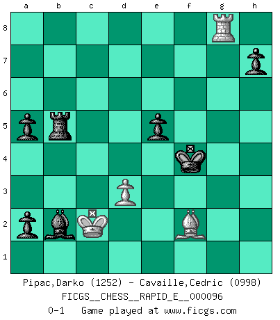 Last move : 0-1 2013 March 1 10:12:58 [Event "FICGS__CHESS__RAPID_E__000096"] [Site "FICGS"] [Date "2013.02.10"] [Round "1"] [White "Pipac,Darko"] [Black "Cavaille,Cedric"] [Result "0-1"] [WhiteElo "1252"] [BlackElo "0998"] 1.e4 e5 2.Nf3 Nf6 3.Nxe5 Nxe4 4.Qe2 Nf6 5.Nc6 Qe7 6.Nxe7 Bxe7 7.Nc3 Nc6 8.a3 a6 9.Qf3 O-O 10.d3 d5 11.h3 Rd8 12.Qg3 Nd4 13.Kd1 Bd6 14.Qg5 Ne6 15.Qe3 d4 16.Qd2 dxc3 17.Qxc3 b5 18.Bh6 Bb7 19.Rg1 c6 20.g4 Be7 21.Be3 Rac8 22.Bg2 Ba8 23.Kd2 c5 24.Bxa8 Rxa8 25.Rae1 Rdc8 26.f4 c4 27.Qe5 cxd3 28.cxd3 Rc6 29.f5 Bd6 30.Qxf6 gxf6 31.fxe6 fxe6 32.Bf2 e5 33.Rc1 Rac8 34.Rxc6 Rxc6 35.Bh4 Bc5 36.Rf1 Kg7 37.Rf5 a5 38.g5 Kg6 39.Rf3 fxg5 40.Bg3 Bd4 41.Rf8 Bxb2 42.Rg8+ Kh6 43.a4 bxa4 44.Ra8 Rc5 45.Bf2 Rb5 46.h4 a3 47.hxg5+ Kxg5 48.Kc2 a2 49.Rg8+ Kf4 0-1 Petrov : Damiano variation Kingside Castling by player Black (move 9) Player Black won this chess game. Follow this game move after move (download)Chess is a cold bath for the mind. (Sir John Simon) Die Idee von Capablanca, Schach als Fach in den Schulen zu lehren, ist großartig. (Fidel Castro) Debemos de asegurarnos de que el Ajedrez no se convierta en un lenguaje muerto, muy interesante, pero solo para un grupo muy pequeño. (Sytze Faber) Le temps de noter son nom sur la feuille de partie, j'étais déjà en zeitnot ! D'un modeste amateur apparié lors de la première ronde d'un open contre le grand-maître Azmaïparashvili. In God we trust, all others we virus scan. (Anonymous)