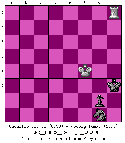 Last move : 1-0 2013 February 13 16:33:33 [Event "FICGS__CHESS__RAPID_E__000096"] [Site "FICGS"] [Date "2013.02.10"] [Round "1"] [White "Cavaille,Cedric"] [Black "Vesely,Tomas"] [Result "1-0"] [WhiteElo "0998"] [BlackElo "1098"] 1.d4 c5 2.c4 cxd4 3.Qxd4 Nc6 4.Qd1 e5 5.e4 Nd4 6.Ne2 Bc5 7.Be3 Qh4 8.Qd3 Nf6 9.Ng3 b6 10.Be2 Bb7 11.Bxd4 Bxd4 12.Nc3 Qf4 13.Qf3 Bxc3+ 14.bxc3 Bxe4 15.Qxf4 exf4 16.Nxe4 Nxe4 17.Rc1 O-O 18.Bf3 f5 19.O-O Rac8 20.Rfd1 Rxc4 21.Rxd7 Re8 22.Rxa7 Rxc3 23.Rxc3 Nxc3 24.h3 b5 25.a3 g5 26.Ra5 Re1+ 27.Kh2 Ra1 28.g4 fxg4 29.hxg4 Ra2 30.Bc6 Rxf2+ 31.Kg1 Rb2 32.Kf1 Kf7 33.a4 Rb1+ 34.Kf2 bxa4 35.Bxa4 Rb2+ 36.Ke1 Re2+ 37.Kf1 f3 38.Bb3+ Kf6 39.Rf5+ Kg6 40.Rxf3 Re4 41.Bc2 h5 42.Bxe4+ Nxe4 43.gxh5+ Kxh5 44.Rh3+ Kg6 45.Ke2 Kf5 46.Rf3+ Kg4 47.Ke3 Ng3 48.Rf8 Kh3 49.Kf3 g4+ 50.Kf4 Ne2+ 51.Ke3 Ng1 52.Rg8 g3 53.Kf4 Ne2+ 54.Kf3 Ng1+ 55.Kf4 g2 56.Rh8+ 1-0 Old Benoni defense Kingside Castling by player Black (move 17) Kingside Castling by player White (move 19) 10 pieces endgame at move 35 : White KRBP , Black KRNPPP WHITE : King + 1 Rook 1 Bishop 1 Pawn BLACK : King + 1 Rook 1 Knight 3 Pawns 9 pieces endgame at move 40 : White KRBP , Black KRNPP WHITE : King + 1 Rook 1 Bishop 1 Pawn BLACK : King + 1 Rook 1 Knight 2 Pawns 8 pieces endgame at move 42 : White KRBP , Black KNPP WHITE : King + 1 Rook 1 Bishop 1 Pawn BLACK : King + 1 Knight 2 Pawns 7 pieces endgame at move 42 : White KRP , Black KNPP WHITE : King + 1 Rook 1 Pawn BLACK : King + 1 Knight 2 Pawns 6 pieces endgame at move 43 : White KRP , Black KNP WHITE : King + 1 Rook 1 Pawn BLACK : King + 1 Knight 1 Pawn 5 pieces endgame at move 43 : White KR , Black KNP WHITE : King + 1 Rook BLACK : King + 1 Knight 1 Pawn Player White won this chess game. Follow this game move after move (download)Castle early and often. (Rob Sillars) Frage: Was machen Sie mit den Preisen? Anwort: Ich habe Angst, dass meine Freundin davon neue Kleider kauft. (Loek van Wely) Aunque la mayoría de la gente disfruta observar las partidas de los grandes Maestros de ataque, algunos de los jugadores mas notables en la historia han sido los jugadores silenciosos posicionales. Lentamente ellos te aplastan despojandote de tu espacio, congestionando tus piezas y dejandote virtualmente sin nada que hacer. (Yasser Seirawan) Les Echecs sont et restent toujours un combat, un combat intégral comme la boxe, la lutte ou un autre sport, et où il doit y avoir un vainqueur et un vaincu. (Joseph Emil Diemer) Indecision is the key to flexibility. (Unknown)