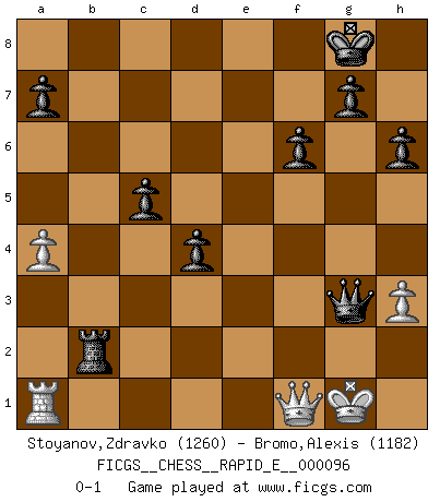 Last move : 0-1 2013 February 10 21:29:57 [Event "FICGS__CHESS__RAPID_E__000096"] [Site "FICGS"] [Date "2013.02.10"] [Round "1"] [White "Stoyanov,Zdravko"] [Black "Bromo,Alexis"] [Result "0-1"] [WhiteElo "1260"] [BlackElo "1182"] 1.e4 e5 2.Nf3 Nc6 3.Bb5 d6 4.Bxc6+ bxc6 5.h3 Nf6 6.d3 Ba6 7.O-O h6 8.Re1 Be7 9.a3 O-O 10.Be3 Nd7 11.Nbd2 d5 12.exd5 cxd5 13.d4 e4 14.Ne5 Nxe5 15.dxe5 Re8 16.Bd4 c5 17.Be3 Rc8 18.Qc1 Bg5 19.Nb3 Bxe3 20.Rxe3 Rxe5 21.Rg3 Qf6 22.c3 Bc4 23.Nd2 Ba6 24.c4 d4 25.b3 e3 26.Rf3 exf2+ 27.Rxf2 Qc6 28.Nf3 Re3 29.Qd2 Rce8 30.Kf1 Rxb3 31.Qf4 Bxc4+ 32.Kg1 f6 33.a4 Re2 34.Nd2 Rxf2 35.Qxf2 Rb2 36.Qe1 Bd5 37.Nf3 Bxf3 38.gxf3 Qxf3 39.Qf1 Qg3+ 0-1 Ruy Lopez : Old Steinitz defense Kingside Castling by player White (move 7) Kingside Castling by player Black (move 9) Player Black won this chess game. Follow this game move after move (download)There are two classes of men; those who are content to yield to circumstances and who play whist; those who aim to control circumstances, and who play Chess. (Mortimer Collins) Im Hotelzimmer gab es nur zwei Schaben. (Über die Turnierbedingungen) (Peter Swidler) La señal de un Gran Maestro es su habilidad de ganar una partida rápidamente y sin dolor. (Irving Chernev) Les sacrifices démontrent seulement que quelqu'un a gaffé. (Savielly Tartacover) When the going gets tactical, the computers get going. (Hyatt)