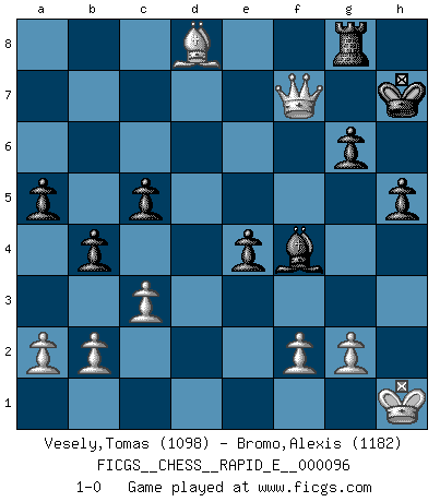 Last move : 1-0 2013 February 19 17:24:46 [Event "FICGS__CHESS__RAPID_E__000096"] [Site "FICGS"] [Date "2013.02.10"] [Round "1"] [White "Vesely,Tomas"] [Black "Bromo,Alexis"] [Result "1-0"] [WhiteElo "1098"] [BlackElo "1182"] 1.e4 e5 2.Nf3 Nc6 3.d4 exd4 4.Nxd4 Nxd4 5.Qxd4 c5 6.Qe5+ Qe7 7.Qf4 Nf6 8.Bc4 d5 9.Bb5+ Bd7 10.Bxd7+ Nxd7 11.O-O dxe4 12.Nc3 Nf6 13.Nb5 Nd5 14.Qg3 a6 15.Nc3 Nxc3 16.Qxc3 b5 17.Be3 b4 18.Qc4 g6 19.c3 a5 20.Rfd1 Rc8 21.Rd2 Bg7 22.Qb5+ Kf8 23.Qa6 Qc7 24.Bg5 Be5 25.Bf6 Bxh2+ 26.Kh1 Bf4 27.Rd5 Rg8 28.Rad1 h5 29.Rd8+ Rxd8 30.Rxd8+ Qxd8 31.Bxd8 Kg7 32.Qf6+ Kh7 33.Qxf7+ 1-0 Scotch game Kingside Castling by player White (move 11) Player White won this chess game. Follow this game move after move (download)When you play Bobby, it is not a question if you win or lose. It is a question if you survive. (Boris Spassky) Du musst Deinen Gegner in einen tiefen dunklen Wald führen wo 2+2=5 ist und wo der Weg, der wieder hinausführt, nur breit genug für einen ist. (Mikhail Nekhemyevich Tal) Sin errores no puede haber brillantez. (Emanuel Lasker) Il n'y a plus de joueurs du niveau de Jacob Murray dont la seule quête est le beau jeu, le plaisir de voir les pièces construire quelque chose. Sur 10 idées à la minute, 9 seront sans intérêt, la dernière s'avèrera géniale. (Christian Bauer) A generalist learns less and less about more and more until he knows nothing about everything. (Author unknown)