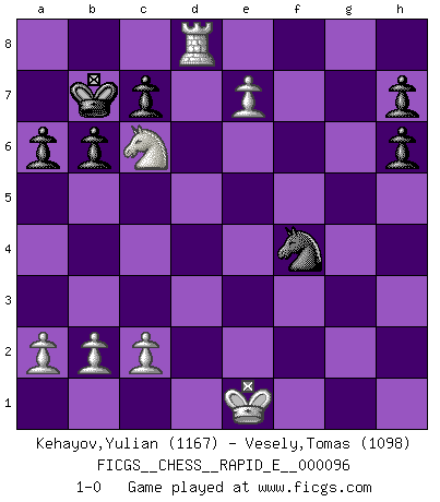 Last move : 1-0 2013 February 21 18:13:1 [Event "FICGS__CHESS__RAPID_E__000096"] [Site "FICGS"] [Date "2013.02.10"] [Round "1"] [White "Kehayov,Yulian"] [Black "Vesely,Tomas"] [Result "1-0"] [WhiteElo "1167"] [BlackElo "1098"] 1.e4 e5 2.Nf3 Nc6 3.Nc3 Bc5 4.Nxe5 Nxe5 5.d4 Bxd4 6.Qxd4 d6 7.f4 Qh4+ 8.Qf2 Qxf2+ 9.Kxf2 Ng4+ 10.Kg3 f5 11.e5 b6 12.Nb5 Kd7 13.h3 N4h6 14.Bc4 a6 15.Be6+ Kc6 16.Nd4+ Kb7 17.Bd5+ Kb8 18.Bxa8 Kxa8 19.Re1 dxe5 20.fxe5 Bb7 21.Bf4 Ne7 22.Rad1 Nd5 23.e6 Re8 24.Bxh6 gxh6 25.Nxf5 Rg8+ 26.Kf2 Nf4 27.e7 Rxg2+ 28.Kf1 Bc6 29.Rd8+ Kb7 30.Nd4 Rh2 31.Nxc6 Rh1+ 32.Kf2 Nxh3+ 33.Ke2 Nf4+ 34.Kd1 Rxe1+ 35.Kxe1 1-0 Three knights game Player White won this chess game. Follow this game move after move (download)If I win a tournament, I win it by myself. I do the playing. Nobody helps me. (Bobby Fischer) Die jungen Leute sollen verstehen, dass sie noch etwas von mir lernen können und müssen. (Viktor Kortschnoi) Morphy probablemente fue el genio más grande de todos. (Bobby Fischer) Le jeu d'échecs est comme rejeté hors du temps. (Antoine de Saint-Exupéry) A mistake is only a mistake if you let it happen twice. Otherwise it is a learning experience. (Daniel Parmet)