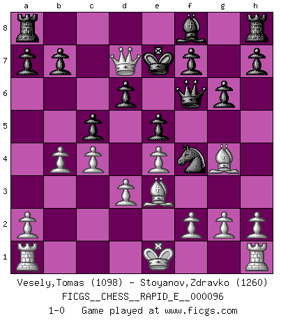 Last move : 1-0 2013 February 12 16:41:46 [Event "FICGS__CHESS__RAPID_E__000096"] [Site "FICGS"] [Date "2013.02.10"] [Round "1"] [White "Vesely,Tomas"] [Black "Stoyanov,Zdravko"] [Result "1-0"] [WhiteElo "1098"] [BlackElo "1260"] 1.c4 c5 2.e4 Nc6 3.Nf3 e5 4.Nc3 d6 5.d3 Bg4 6.Be2 Bxf3 7.Bxf3 Nd4 8.Be3 Ne6 9.Bg4 g6 10.Nd5 Nf6 11.Nxf6+ Qxf6 12.Qa4+ Ke7 13.b4 Nf4 14.Qd7+ 1-0 English : Symmetrical variation Player White won this chess game. Follow this game move after move (download)Dazzling combinations are for the many, shifting wood is for the few. (Georg Kieninger) Wenn du auf das Glück wartest, wird das Leben ziemlich langweilig. (Mikhail Nekhemyevich Tal) El Ajedrez es un mar en el cual un mosquito puede beber y un elefante puede bañarse. (Refrán Hindú) Les écrivains ont utilisé les échecs pour analyser les côtés extrêmes de la nature humaine. Dans ce cadre, les échecs offrent un champ d'expérimentation idéal. Mais on pourrait faire la même chose avec la peinture. Et là, en vous référant à Van Gogh, vous ne tirerez pas de conclusion définitive sur les peintres. (Gary Kasparov) Your best chance to get a Royal Flush in a casino is in the bathroom. (Anonymous)