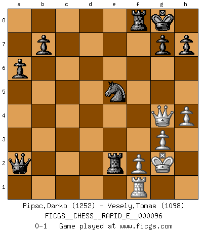 Last move : 0-1 2013 March 16 11:49:15 [Event "FICGS__CHESS__RAPID_E__000096"] [Site "FICGS"] [Date "2013.02.10"] [Round "1"] [White "Pipac,Darko"] [Black "Vesely,Tomas"] [Result "0-1"] [WhiteElo "1252"] [BlackElo "1098"] 1.e4 c5 2.Nf3 d5 3.d4 dxe4 4.Bb5+ Bd7 5.Bxd7+ Qxd7 6.Ng5 cxd4 7.O-O e5 8.Nxe4 Qf5 9.Qd3 Qc8 10.Bd2 f5 11.Qb5+ Nd7 12.Bb4 fxe4 13.Bxf8 a6 14.Qe2 Nxf8 15.Qxe4 Nd7 16.Nd2 Ngf6 17.Qf5 O-O 18.Ne4 Nxe4 19.Qxe4 Rf4 20.Qd5+ Kh8 21.g3 Nf6 22.Qxe5 Re4 23.Qd6 Qxc2 24.Rfe1 Qxb2 25.Rab1 Qxa2 26.Rbd1 Ng4 27.Rf1 Re2 28.Qxd4 Ne5 29.Qf4 Re8 30.Rc1 Nd3 31.Rc8 Rxc8 32.Qd4 Ne1 33.Qf4 Kg8 34.Qg4 Rf8 35.h4 Nf3+ 36.Kg2 Ne5 0-1 Sicilian defense Kingside Castling by player White (move 7) Kingside Castling by player Black (move 17) Player Black won this chess game. Follow this game move after move (download)A chess genius has died; a loss for humanity. (Viktor Kortchnoi, about Bobby Fischer's death) Ich war zu klein für die Schach-Schülermannschaft! (Woody Allen) El Ajedrez es el juego mas altamente simbólico, pero las agresiones estan por lo tanto aún mas francamente representadas en la partida. Tal vez comenzo como un juego de guerra; Algo como la representación de una batalla en miniatura entre las fuerzas de dos reinos. (Karl Meninger) Pour se monter efficace, un Cavalier a besoin d'avant-postes ! Les Cavaliers font les meilleurs bloqueurs de pions passés. When a man with money meets a man with experience, the man with experience leaves with money and the man with money leaves with experience. (Anonymous)