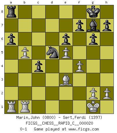 Last move : 0-1 2007 May 7 14:3:48 [Event "FICGS__CHESS__RAPID_C__000020"] [Site "FICGS"] [Date "2007.01.26"] [Round "1"] [White "Marin,John"] [Black "Sert,Ferdi"] [Result "0-1"] [WhiteElo "0800"] [BlackElo "1397"] 1.e4 c5 2.Nf3 d6 3.d4 cxd4 4.Nxd4 Nf6 5.Nc3 g6 6.Bc4 Bg7 7.Be3 O-O 8.f3 Nc6 9.Nxc6 bxc6 10.O-O Bb7 11.Be2 d5 12.e5 Nd7 13.f4 Qa5 14.Qe1 e6 15.a3 c5 16.b4 cxb4 17.Nb5 a6 18.axb4 Qd8 19.Nd6 Qc7 20.c4 dxc4 21.Nxb7 Qxb7 22.Bf3 Qc7 23.Bxa8 Rxa8 24.b5 Nb6 25.Qa5 Nd5 26.Qxc7 Nxc7 27.Rfb1 Nd5 0-1 This chess game has been lost on time (started : 2007.01.26 15:32:5) Sicilian : Dragon variation Kingside Castling by player Black (move 7) Kingside Castling by player White (move 10) Player Black won this chess game. Follow this game move after move (download)One bad move nullifies forty good ones. (Horowitz) Wir irren allesamt, nur jeder irrt anders. (Georg Christoph Lichtenberg) Prefiero perder una partida realmente buena, que ganar una mala. (David Levy) Pour se monter efficace, un Cavalier a besoin d'avant-postes ! Les Cavaliers font les meilleurs bloqueurs de pions passés. Once you start thinking you have nothing left to learn, you have everything to learn. (Steve Badget)