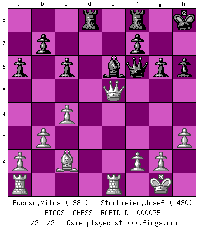 Last move : 1/2-1/2 2013 April 16 16:48:5 [Event "FICGS__CHESS__RAPID_D__000075"] [Site "FICGS"] [Date "2013.02.10"] [Round "1"] [White "Budnar,Milos"] [Black "Strohmeier,Josef"] [Result "1/2-1/2"] [WhiteElo "1381"] [BlackElo "1430"] 1.e4 e5 2.Nf3 Nc6 3.Bb5 a6 4.Ba4 Nf6 5.O-O Be7 6.Re1 O-O 7.d4 exd4 8.Nxd4 Nxd4 9.Qxd4 d6 10.h3 h6 11.e5 Nh7 12.c4 dxe5 13.Qxe5 Bf6 14.Qg3 Kh8 15.Nc3 Be6 16.Bb3 c6 17.Bf4 Bh4 18.Qe3 Bg5 19.Bxg5 Nxg5 20.Ne4 Nxe4 21.Qxe4 Qf6 22.Bc2 g6 23.b3 Rad8 24.Qe5 1/2-1/2 Ruy Lopez : Closed defense Kingside Castling by player White (move 5) Kingside Castling by player Black (move 6) This chess game ended in a draw. Follow this game move after move (download)In Fischer's hands, a slight theoretical advantage is as good a being a Queen ahead. (Isaac Kashdan) Der Umstand, daß uns eine 7 Stunden Zeitkontrolle ermöglicht eine großartige, tiefe Partie zu spielen, ist für die Massenmedien nicht weiter von Bedeutung. (Alexej Shirov) Hay jugadores fuertes y personas amables y yo soy un jugador fuerte. (Bobby Fischer) Il vaut toujours mieux jouer un plan faux de façon logique que de n'avoir pas de plan du tout. (Victor Kortchnoï) There are 10 types of people in this world: those who understand binary and those who don't. (Anonymous)
